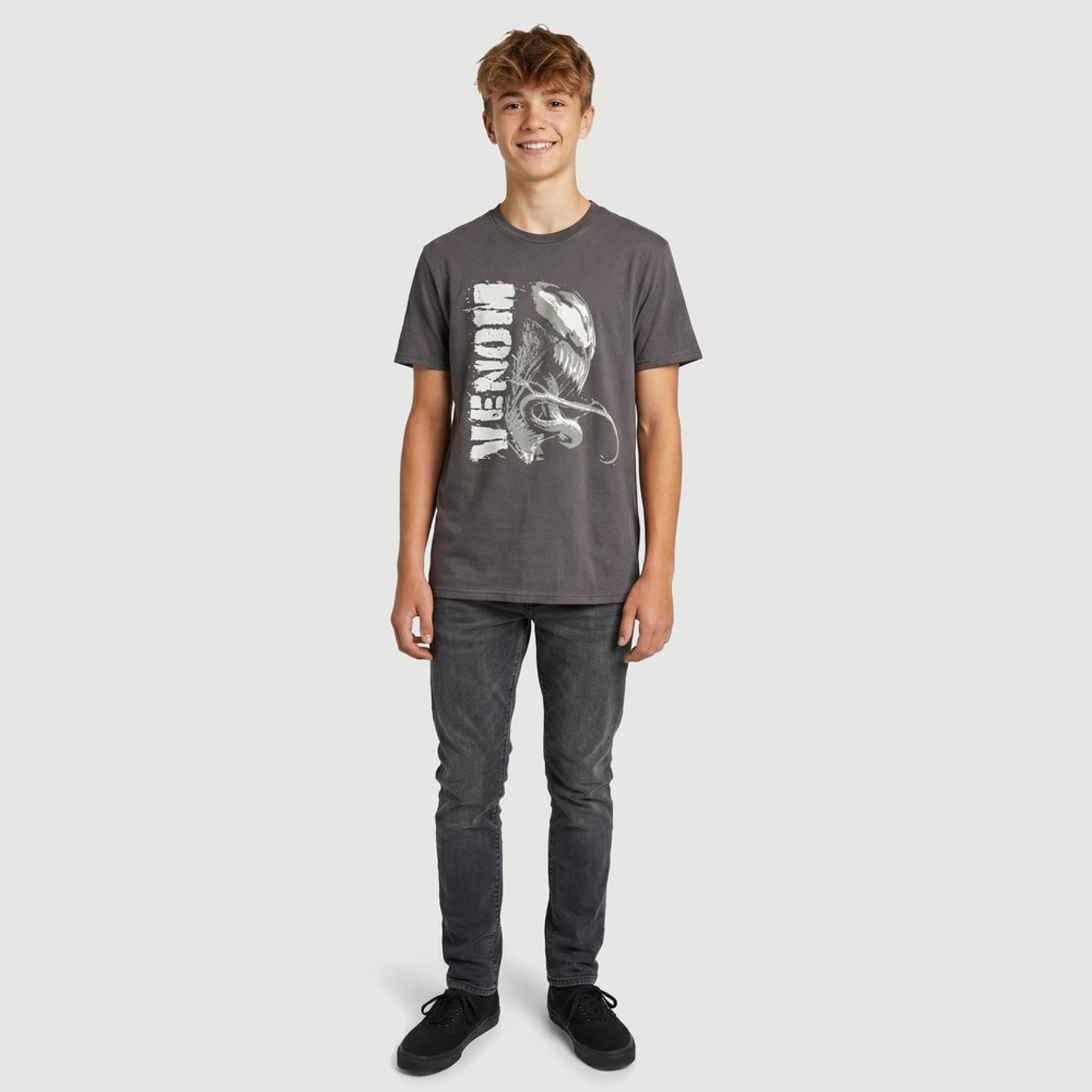 Economia de R$ 13,00Camiseta masculina Marvel confeccionada em malha 100% algodão, com manga curta e gola redonda. A estampa frontal do Venom em tons de cinza com lettering vertical “VENOM” destaca o visual e é ideal para fãs de produtos licenciados. Itens inclusos: 01 camiseta.