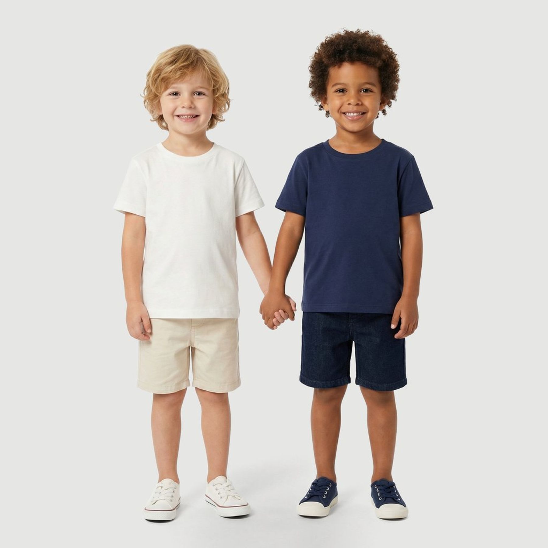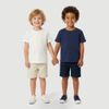 Economia de R$ 3,00Kit com 2 camisetas infantis Toys & Kids em malha de composição mista com predominância de algodão. Uma peça é na cor creme com patch circular discreto no peito e a outra é azul marinho lisa com etiqueta aplicada no peito. As camisetas têm manga curta, gola redonda e modelagem reta, ideais para combinar com bermudas, calças e tênis em diferentes ocasiões.