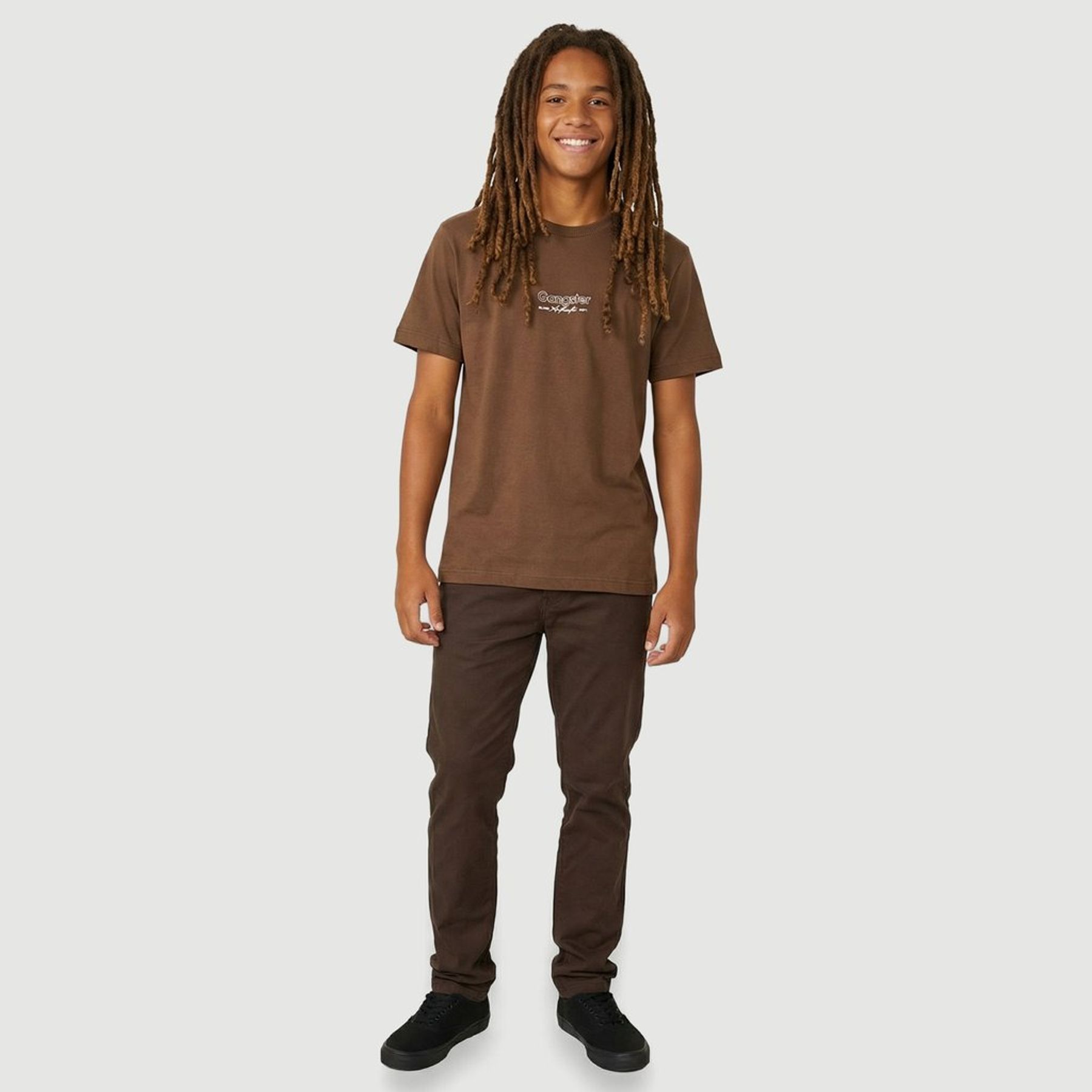 Em tom marrom, traz visual minimalista com estampa frontal pequena centralizada com o texto "Gangster" em cor clara, ideal para combinar com jeans, bermuda ou calça chino.