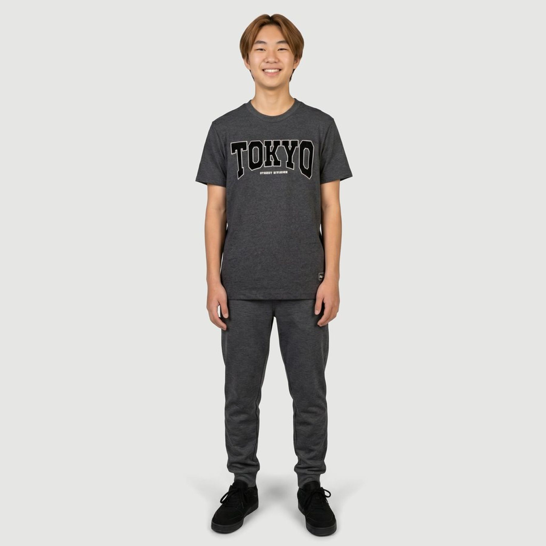 O destaque é a estampa frontal com a escrita “TOKYO” em estilo college e o texto “Street Division” abaixo. A peça tem manga curta, gola redonda e etiqueta aplicada na barra, que complementa o visual.