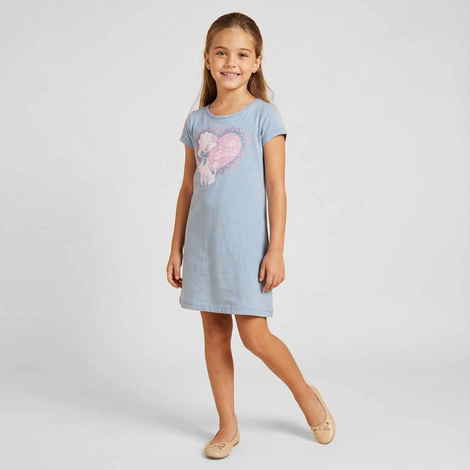 Economia de R$ 31,00A camisola feminina Yeapp é ideal para relaxar em casa e dormir com bem-estar. Confeccionada em malha de composição mista com predominância de algodão, tem toque macio e caimento confortável. O visual azul claro ganha destaque com estampa frontal de poodle e coração com a frase "Cute and Sweet", trazendo um estilo delicado e descontraído.