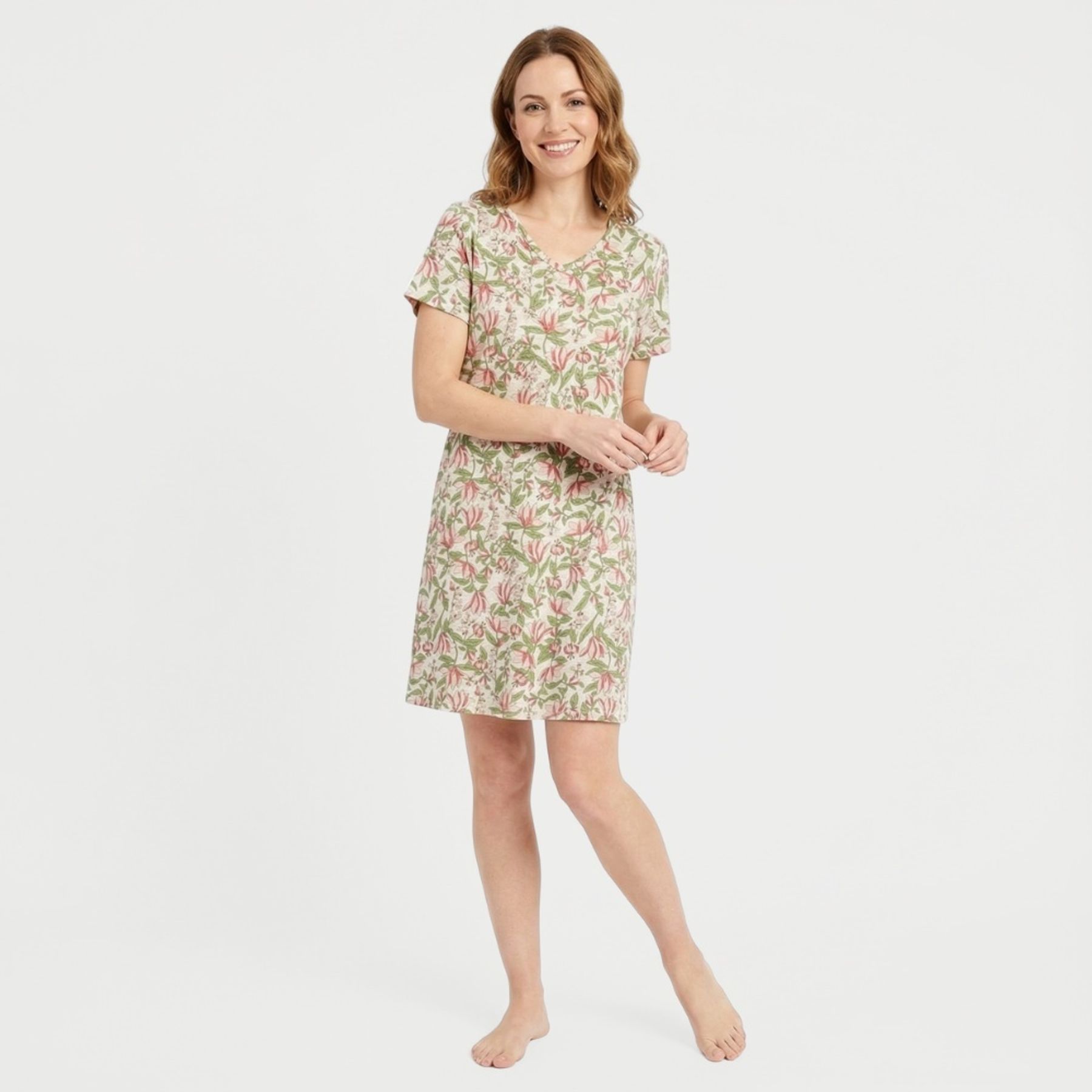 A camisola feminina Uniq combina delicadeza e praticidade para os momentos de descanso. Confeccionada em malha de composição mista com predominância de poliamida, traz estampa floral em tons suaves, gola V e mangas curtas, ideal para dormir ou relaxar em casa.