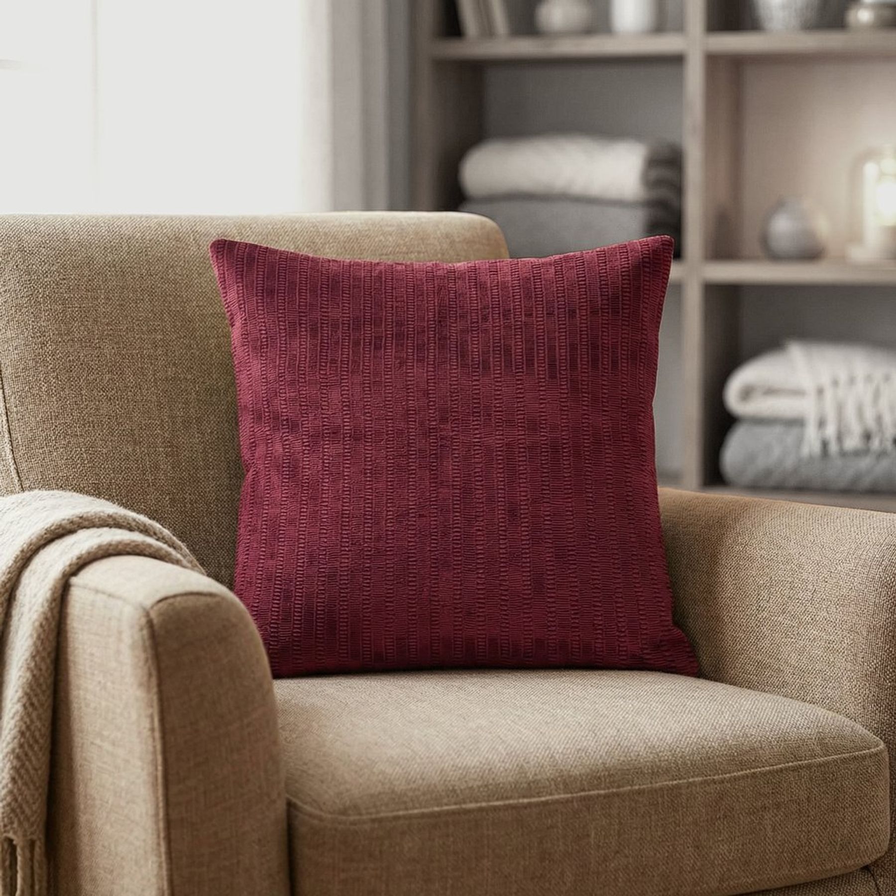 Economia de R$ 5,00A capa de almofada Pernambucanas Casa na cor bordô é ideal para renovar a decoração com um toque moderno e elegante. A superfície com textura em relevo e linhas verticais cria um visual sofisticado e aconchegante, fácil de combinar em sala, quarto ou escritório.