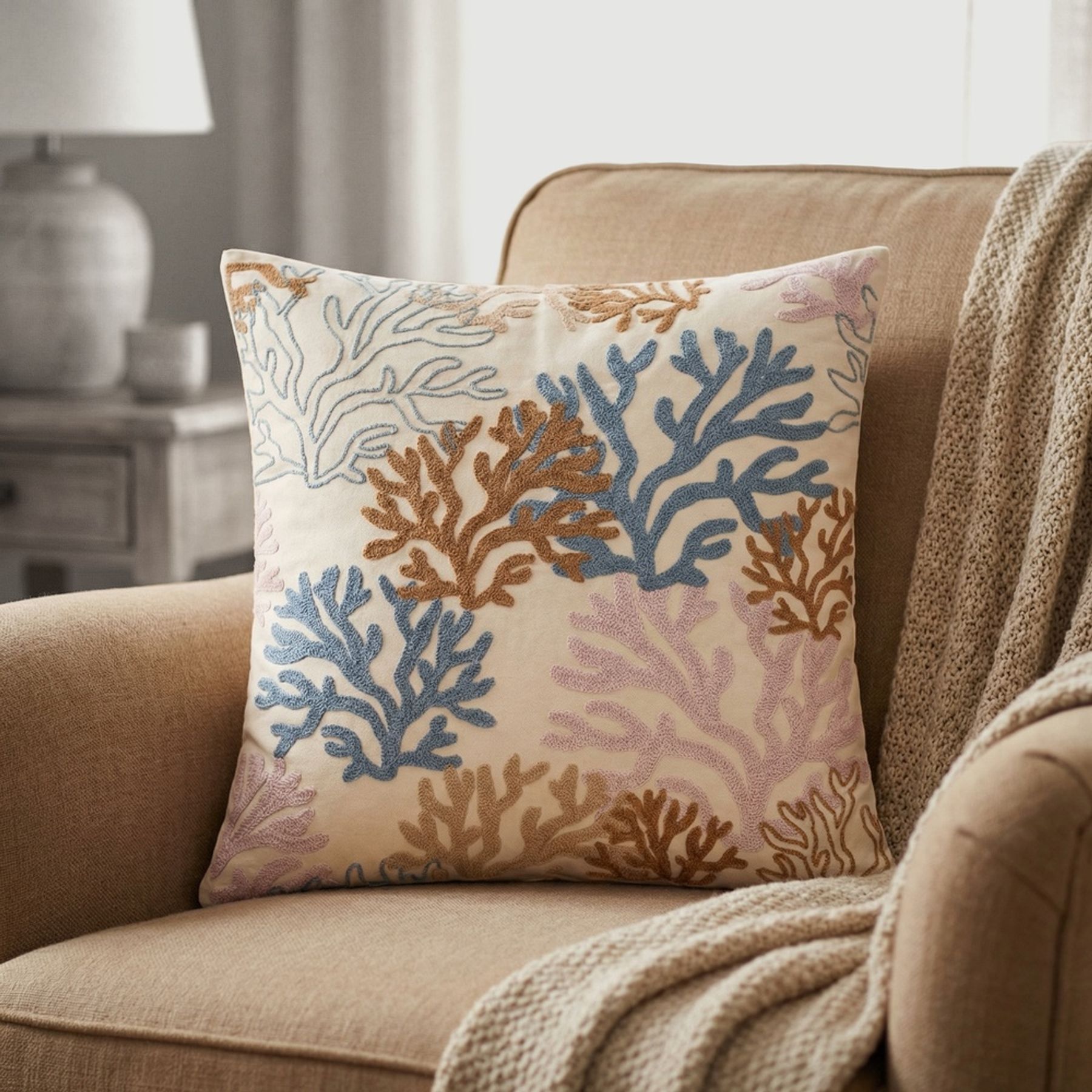 Economia de R$ 6,00A capa de almofada Maris, da Pernambucanas Casa, é uma escolha prática para renovar a decoração do sofá, cama ou poltrona com um toque de inspiração marinha. Confeccionada em 100% algodão, tem base creme e bordado em alto relevo com desenhos de corais em tom azul, criando textura e destaque no visual. Conteúdo da embalagem: 01 capa de almofada.