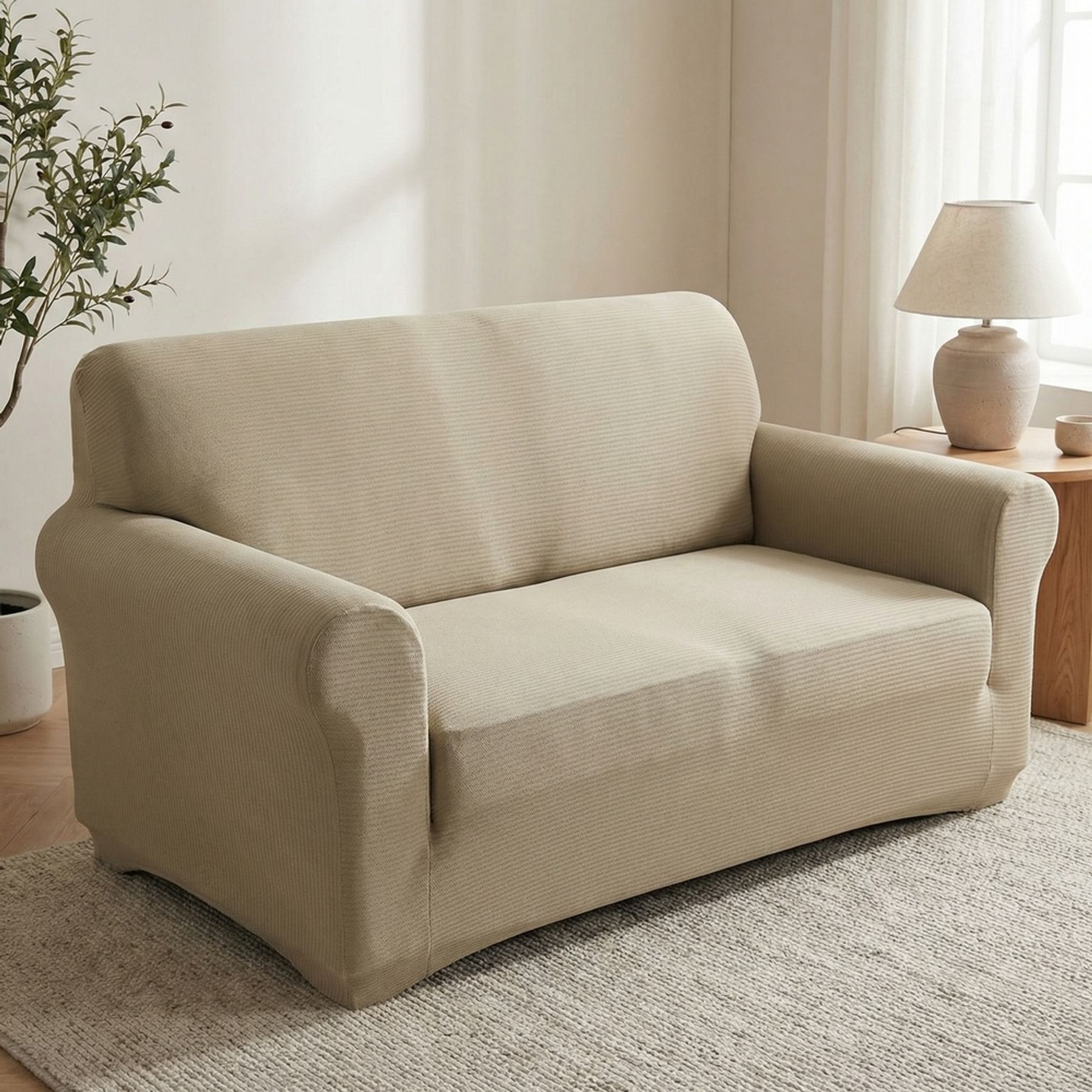 Economia de R$ 14,00A capa de sofá para 2 lugares é ideal para renovar o ambiente com praticidade e um visual elegante. Em bege neutro, combina com diferentes estilos de decoração e traz textura canelada com listras verticais discretas em tom sobre tom, criando um relevo suave.