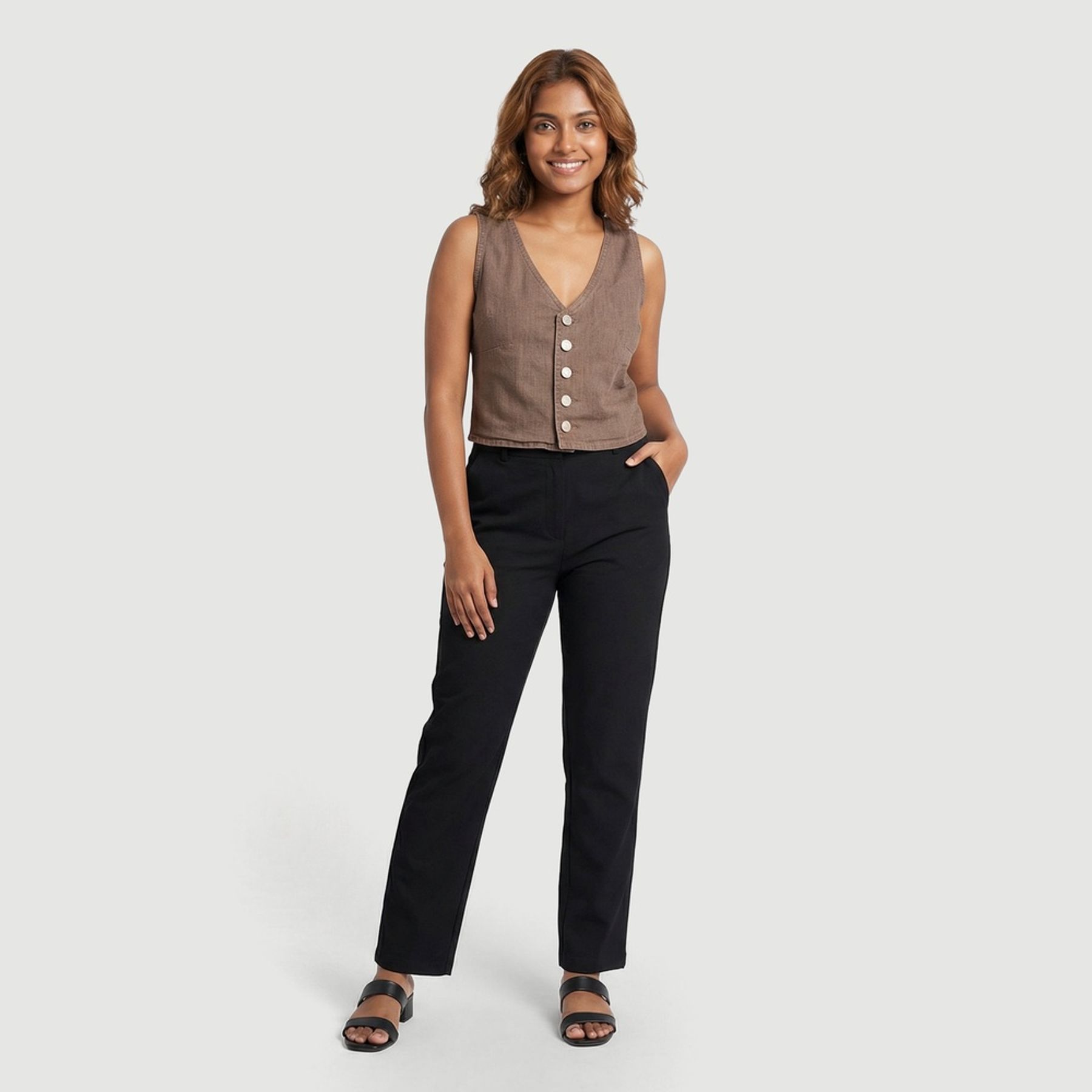 O decote V valoriza o visual e o fechamento frontal com botões claros cria contraste discreto. Os recortes frontais e a barra reta finalizam o design com um toque atual e fácil de usar com blusas, camisetas e vestidos.