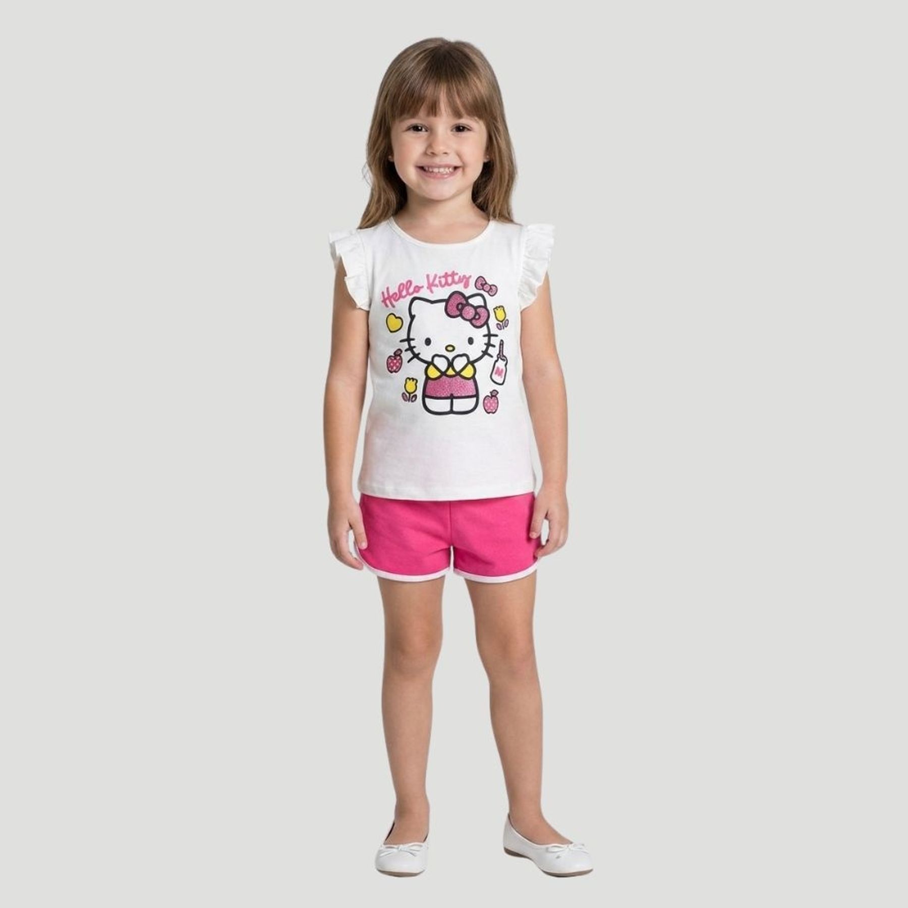 Economia de R$ 14,00Conjunto feminino da Hello Kitty ideal para compor um visual prático e cheio de personalidade. A blusa sem manga em tom creme traz estampa frontal da personagem com elementos decorativos, enquanto o short runner em rosa possui cós elástico e cordão para ajuste, oferecendo melhor encaixe e liberdade de movimento.