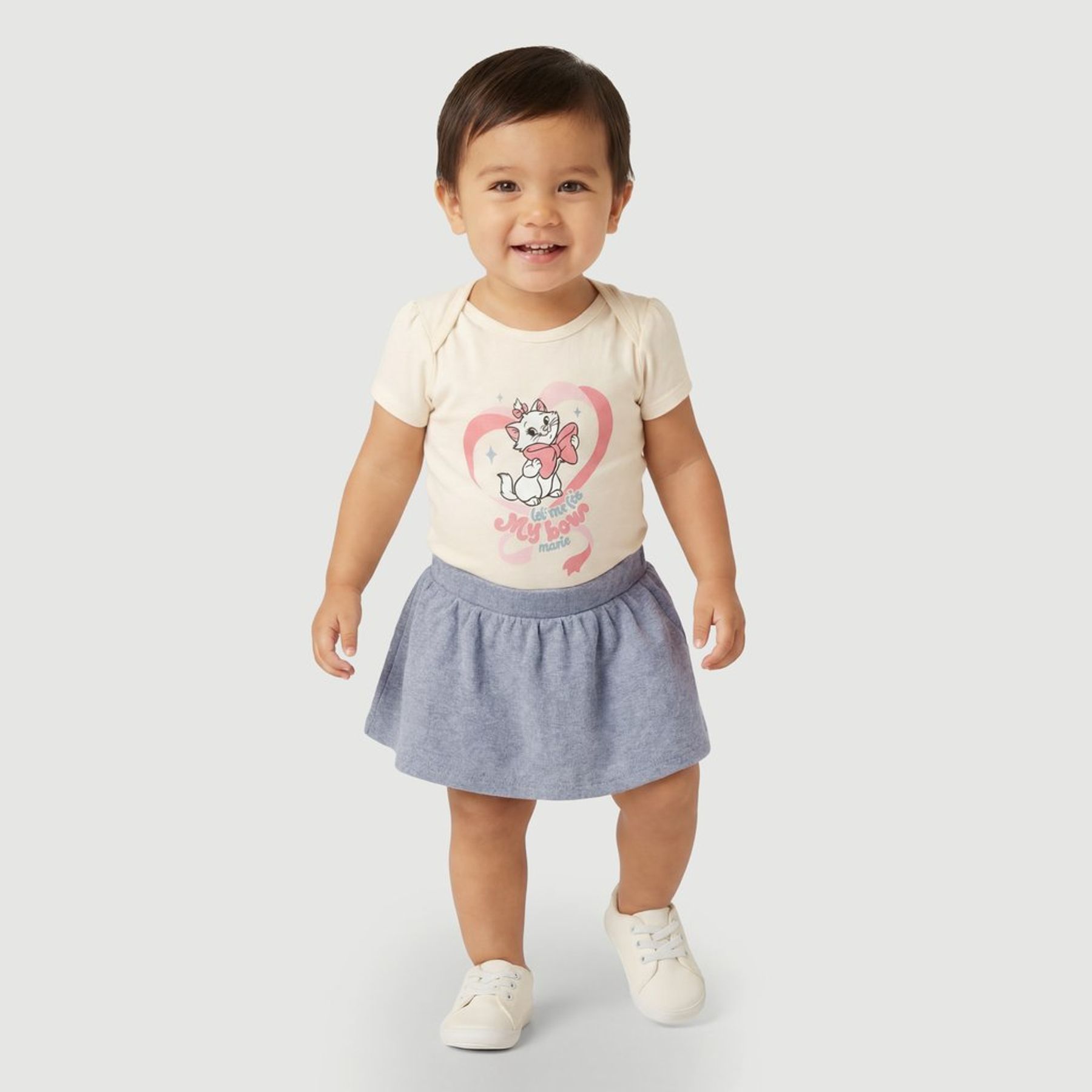 Economia de R$ 6,00Conjunto bebê licenciado Disney com tema Marie (Aristogatos), perfeito para compor um visual delicado. O kit inclui body em malha de composição mista com predominância de algodão, com manga curta, gola redonda e estampa frontal centralizada da personagem. Para facilitar a troca, possui fechamento por botões de pressão no entrepernas. A saia lisa completa o look com cós elástico para melhor ajuste.