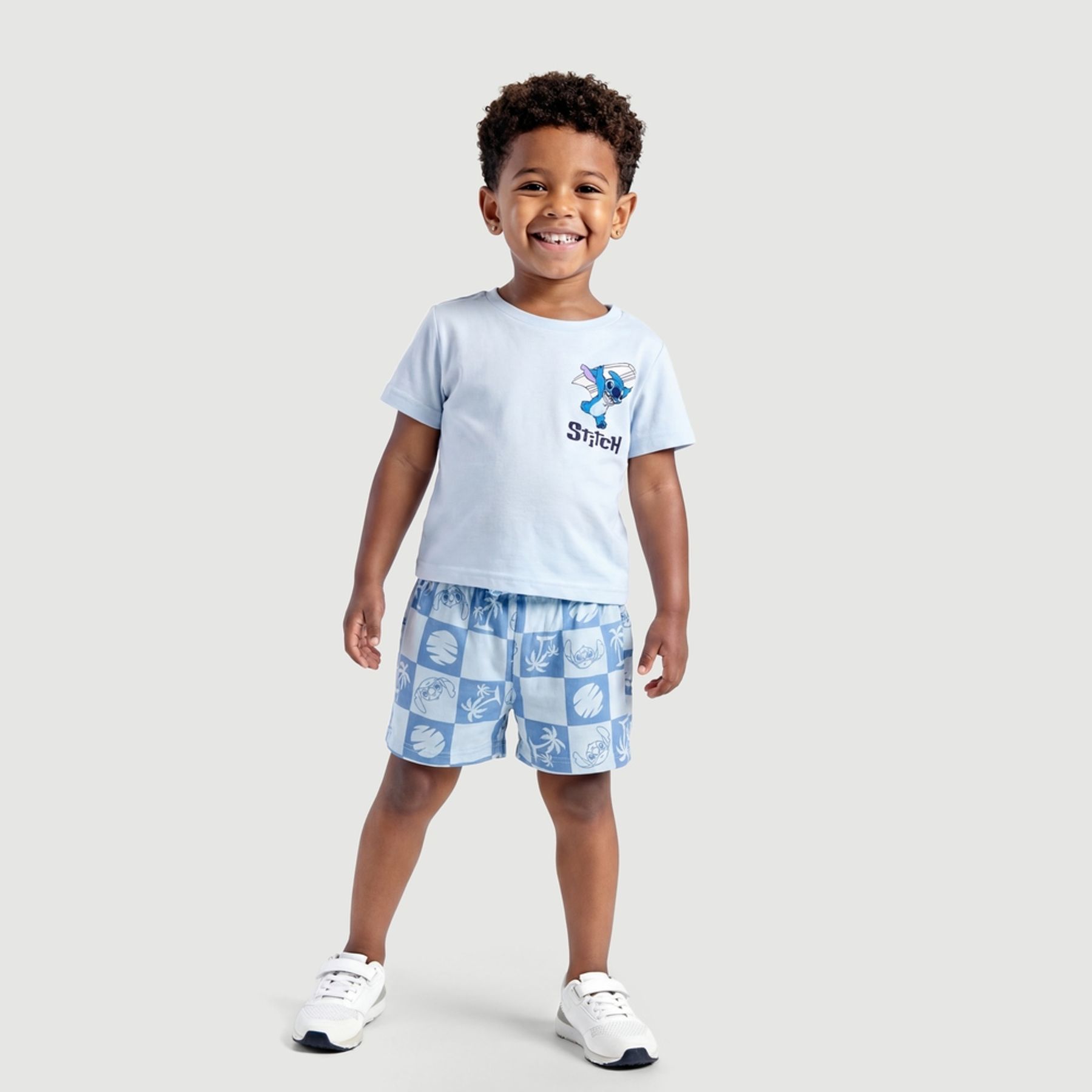 Economia de R$ 6,00Conjunto infantil Disney licenciado de Lilo & Stitch, ideal para momentos de lazer. A camiseta em malha com predominância de algodão tem gola redonda, manga curta, barra simples e estampa frontal localizada do Stitch com prancha e a escrita “Stitch”. A bermuda em microfibra possui cós com elástico e estampa total em xadrez com elementos tropicais, como folhas, palmeiras e rostos do Stitch, com visual de verão.