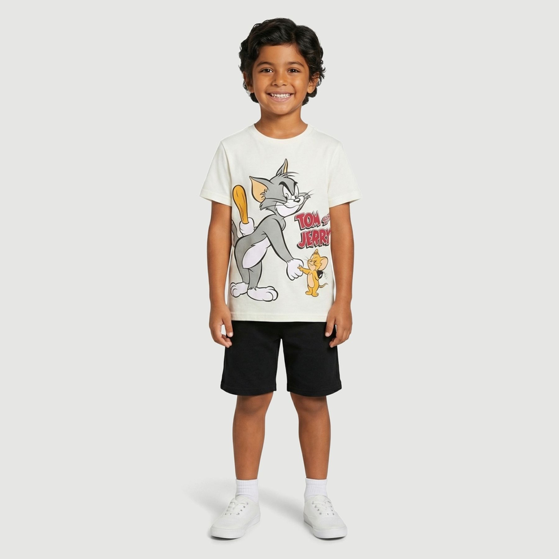 Economia de R$ 5,00Conjunto infantil Tom and Jerry licenciado da Warner, ideal para acompanhar a rotina com praticidade. A camiseta branca em malha tem gola redonda, manga curta e estampa frontal grande centralizada com os personagens e lettering “Tom and Jerry”.