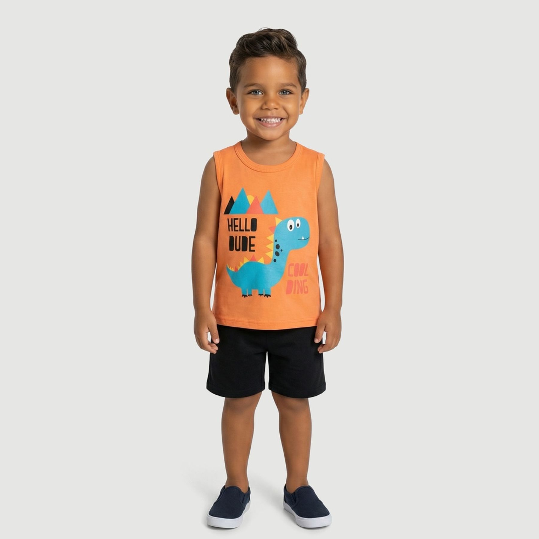 A regata laranja sem manga tem gola redonda, cavas com viés e estampa frontal de dinossauro cartoon, trazendo um visual divertido. A bermuda preta lisa complementa o conjunto com combinação fácil para passeios e brincadeiras.