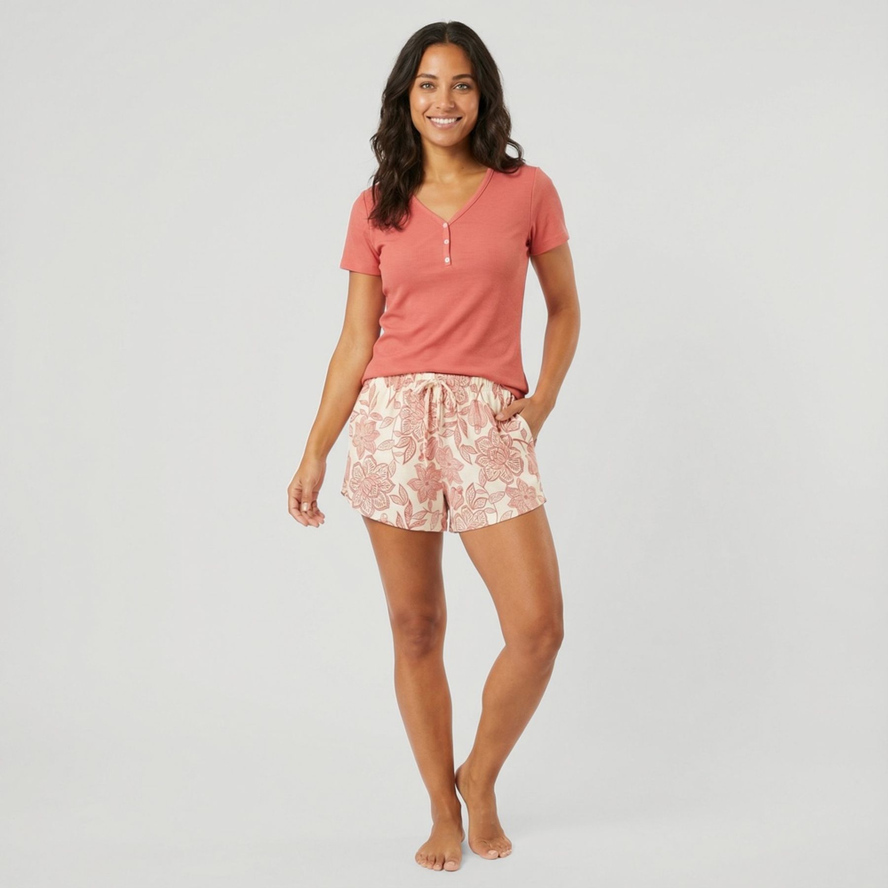 Economia de R$ 8,00Conjunto short doll INK com blusa e shorts em peach sem felpa, com cadarço ajustável.Visual leve e confortável para o descanso.