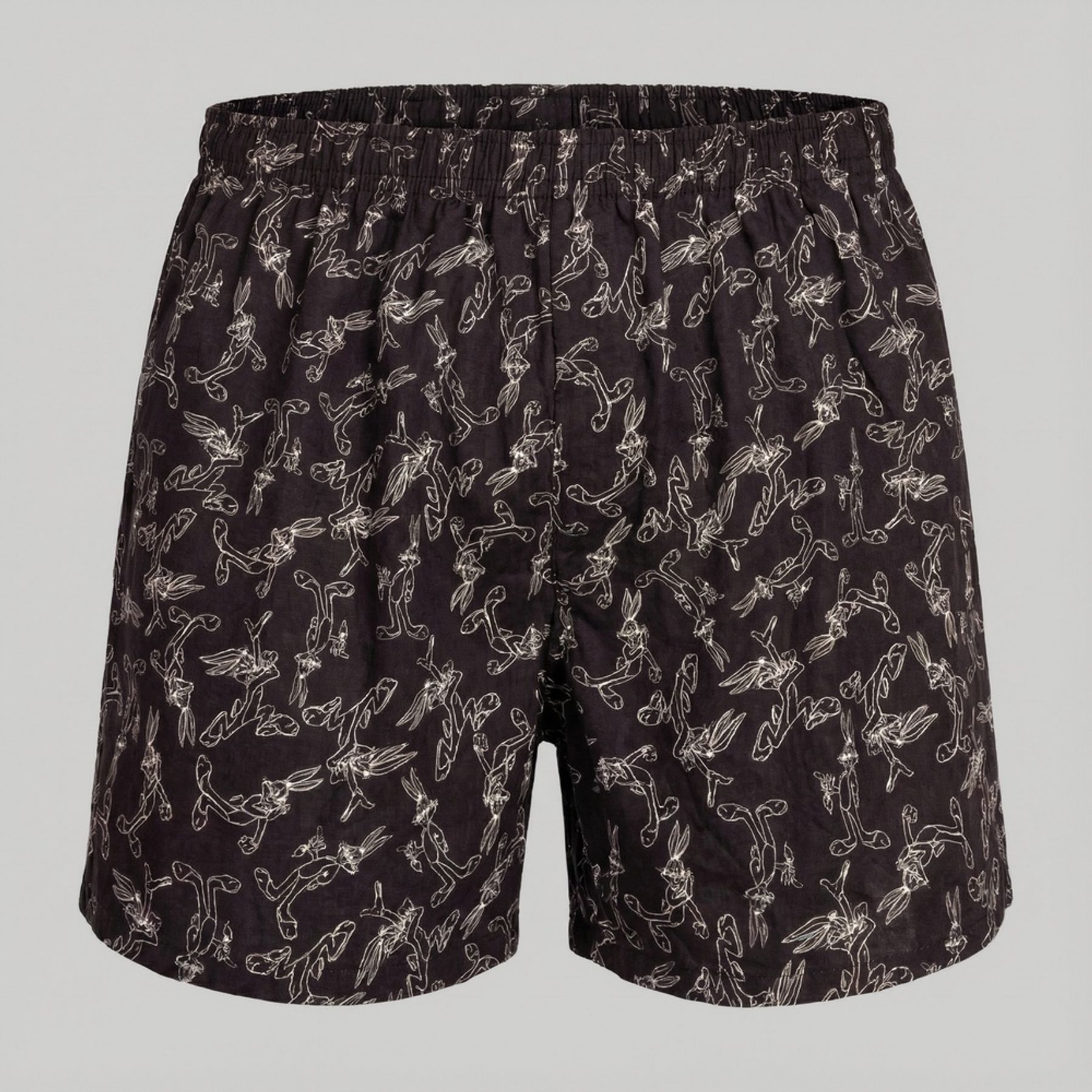 A cueca samba-canção traz estampa total do personagem Pernalonga em traço branco sobre fundo preto. Confeccionada em malha com predominância de algodão, oferece toque macio e bom caimento. O cós elástico garante ajuste confortável e maior liberdade de movimento, sendo uma opção prática para a rotina.