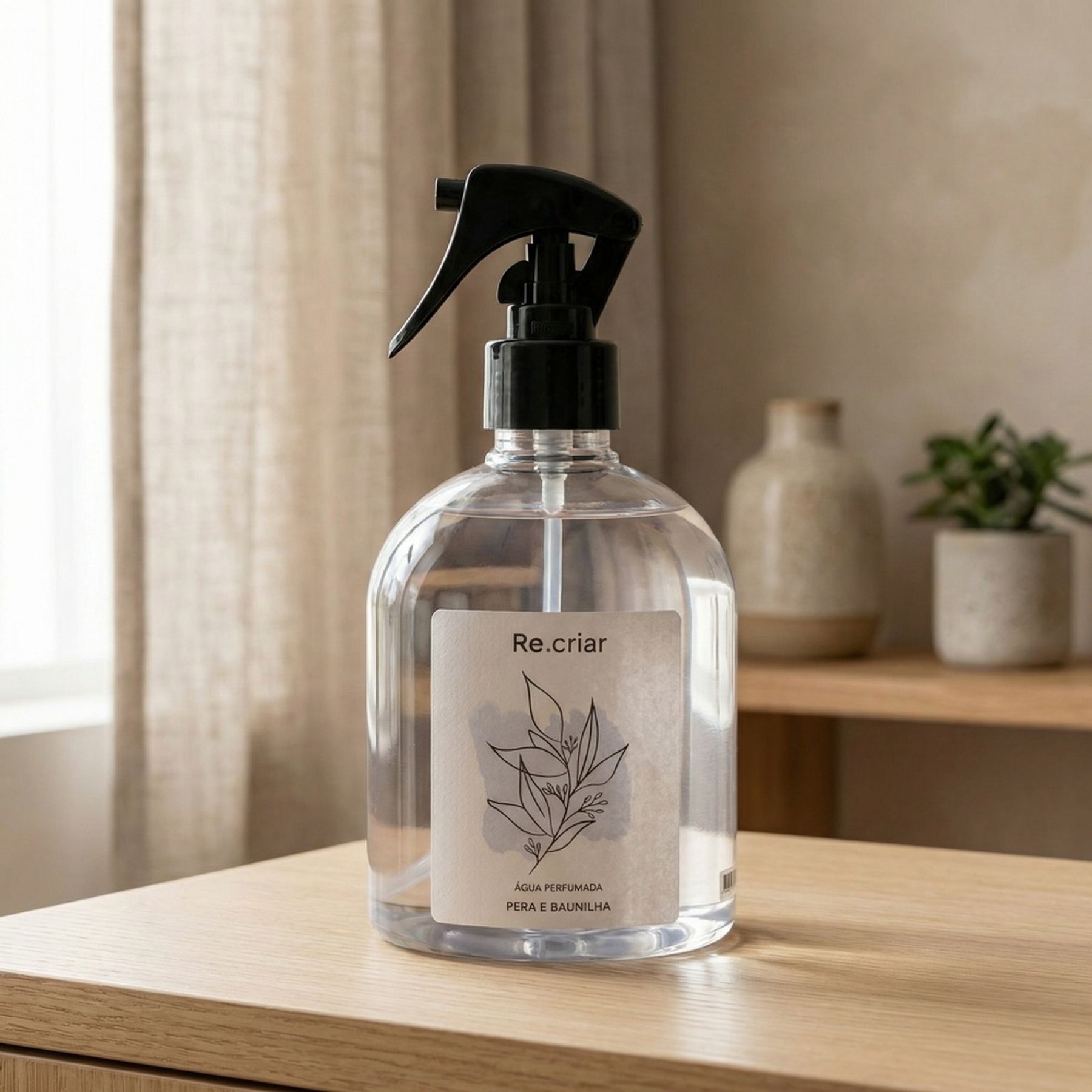 Economia de R$ 2,50A Água Perfumada Re.criar Pera e Baunilha é ideal para perfumar ambientes de forma prática. O frasco transparente conta com válvula spray tipo gatilho, bico aplicador preto e tampa com trava, facilitando a aplicação no dia a dia.