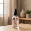 O frasco compacto em plástico transparente, com líquido rosado e válvula spray com tampa preta, combina com a decoração graças ao visual moderno, clean e minimalista. O rótulo com ilustração floral em traço preto e detalhe rosa claro reforça o estilo delicado do produto.