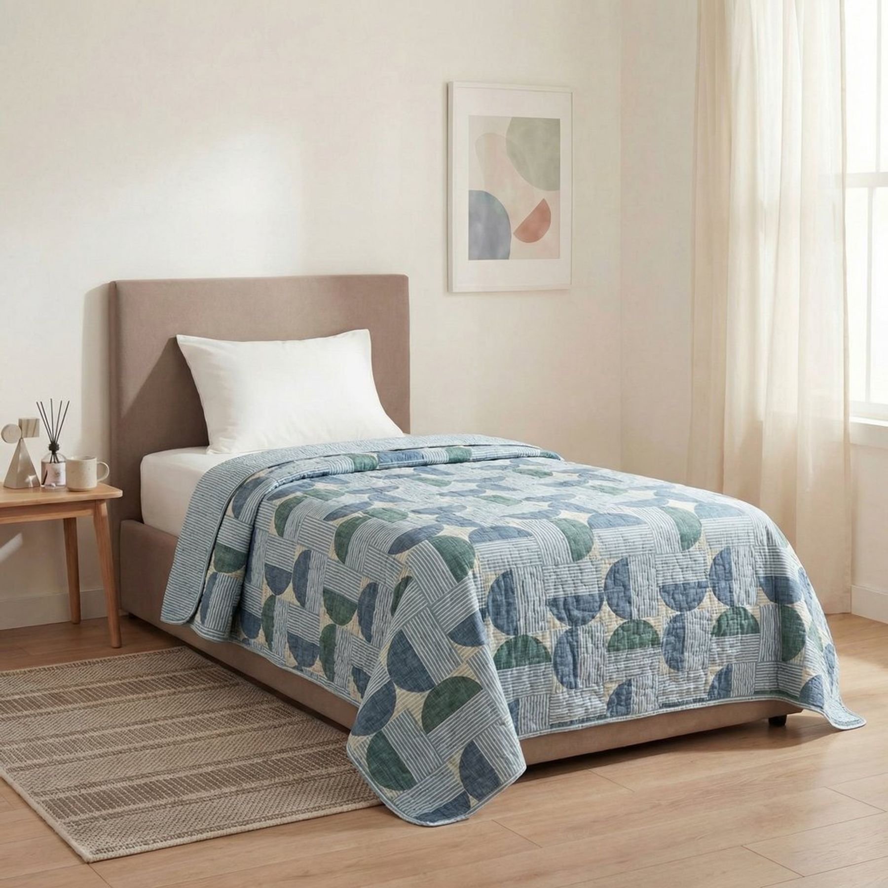 Economia de R$ 6,00A colcha solteiro de microfibra Shapes Formas PNB Pop é ideal para renovar a cama com praticidade e visual moderno. A estampa geométrica em composição tipo patchwork combina listras em azul e branco, trazendo um toque atual para o quarto.