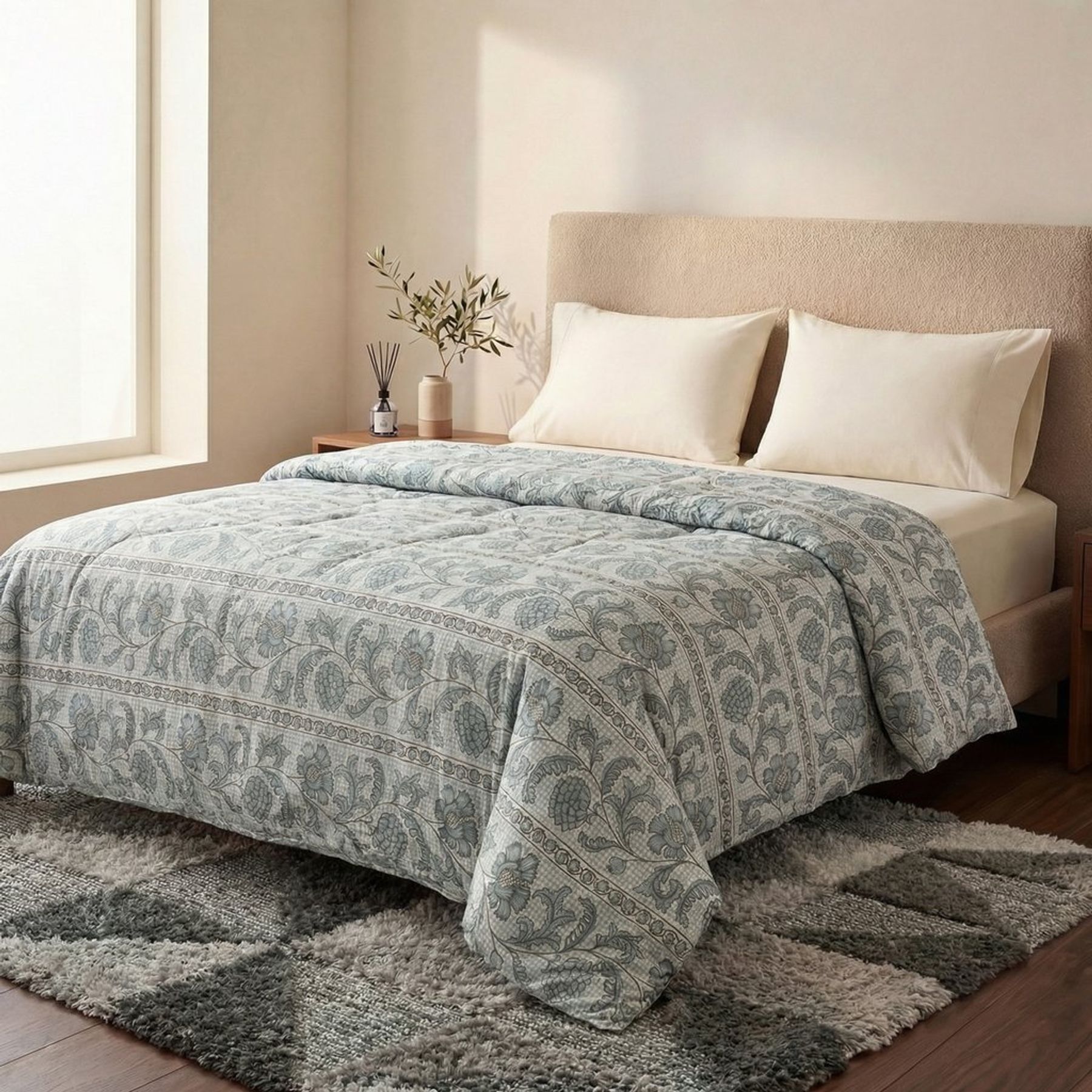 A estampa floral com folhas e flores grandes em tons frios se destaca sobre o fundo claro, combinando bem com quartos de decoração neutra. O matelassê com costura aparente ajuda a manter o enchimento bem distribuído e valoriza o acabamento.
