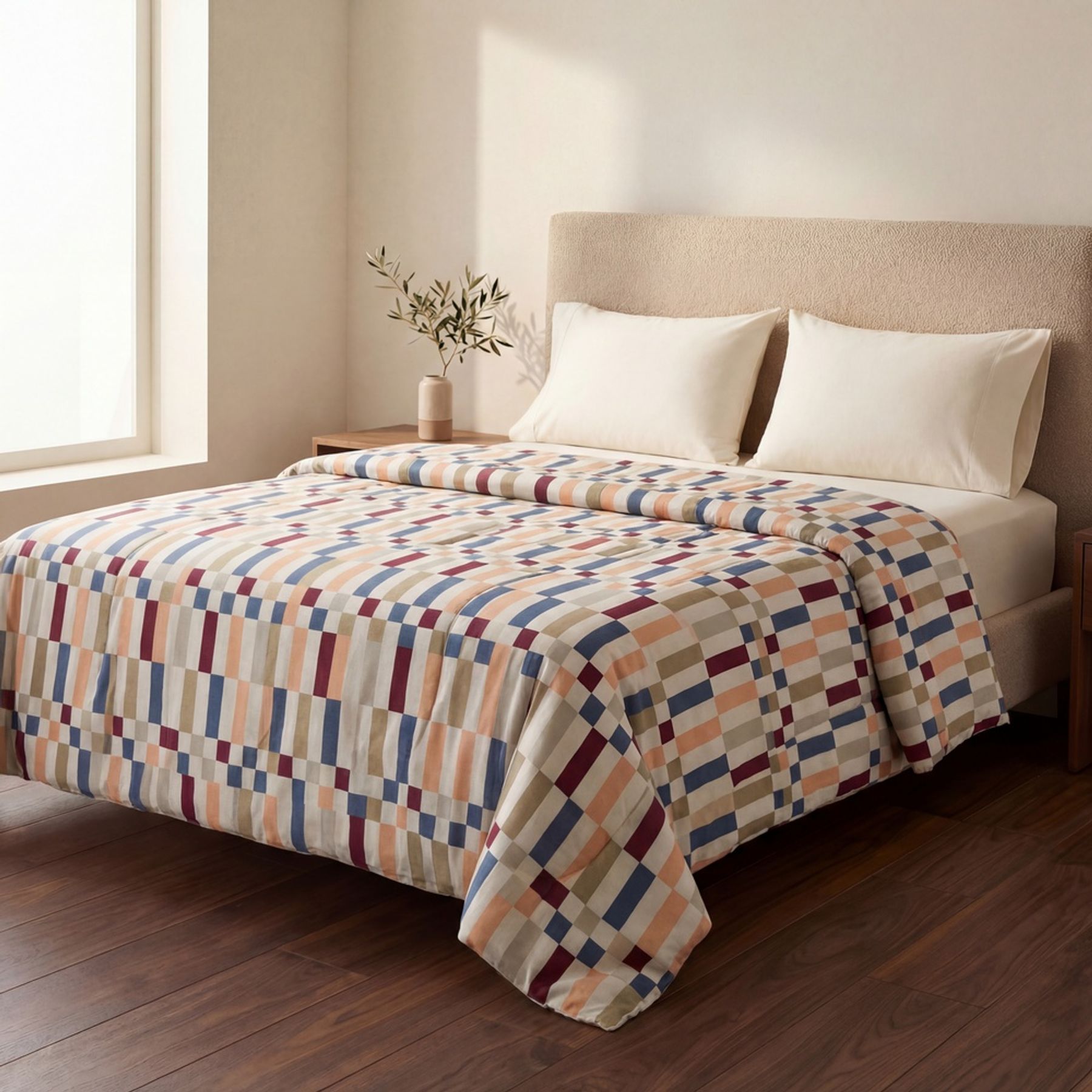 A padronagem geométrica quadriculada em tons neutros adiciona um estilo moderno à cama. O acabamento matelassê e a costura aparente central ajudam no caimento e valorizam o conjunto.