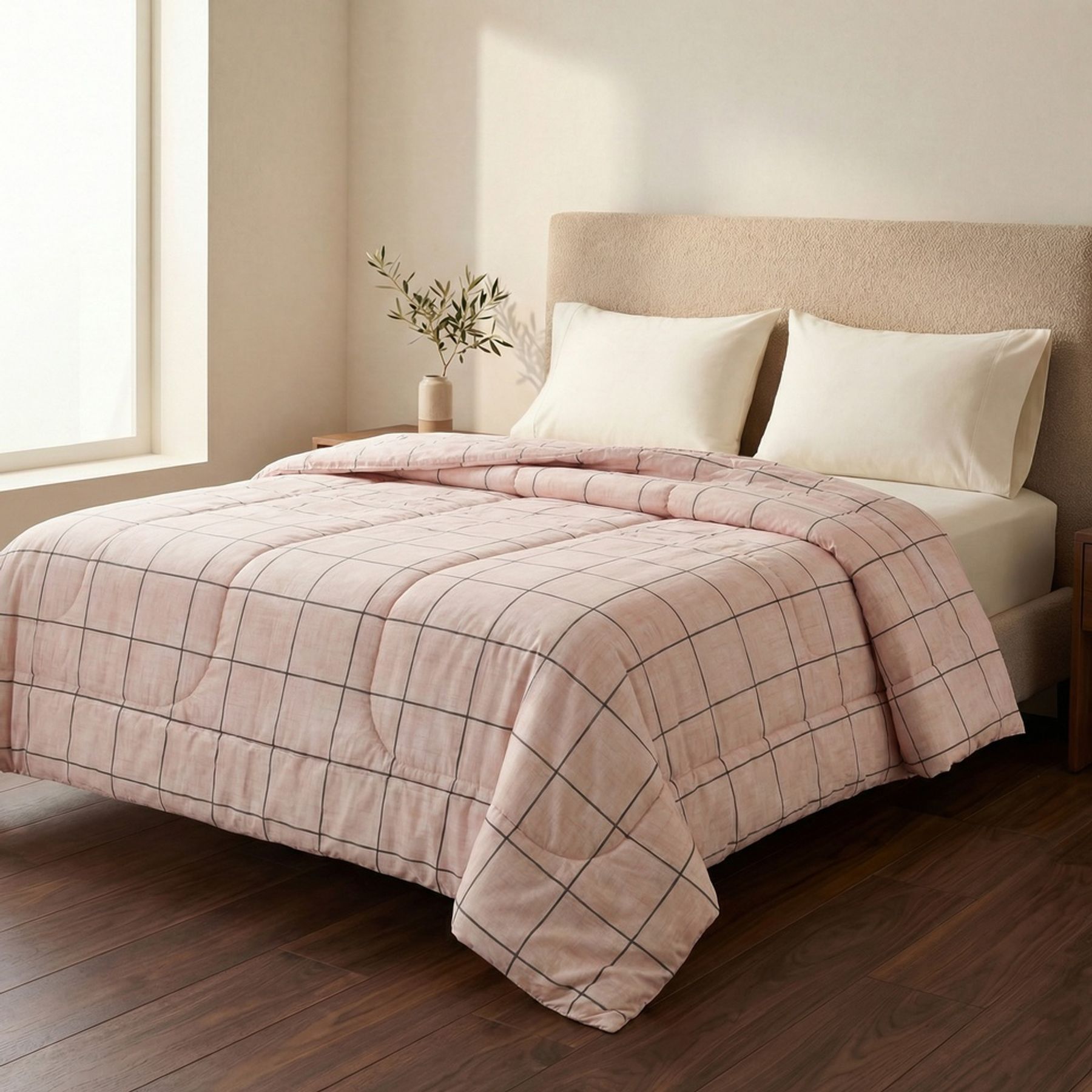 A estampa grid em tons neutros combina facilmente com diferentes estilos de decoração, trazendo um resultado minimalista e versátil para o quarto. Produto composto por: 01 edredom.