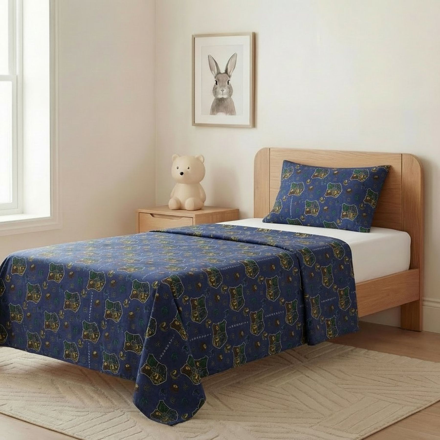 Economia de R$ 8,00O jogo de cama em malha 100% algodão Harry Potter é uma ótima opção para deixar o quarto infantil mais aconchegante e cheio de personalidade. A estampa total traz o brasão de Hogwarts em repetição com a palavra “HOGWARTS” sobre fundo azul marinho, criando um visual temático marcante.