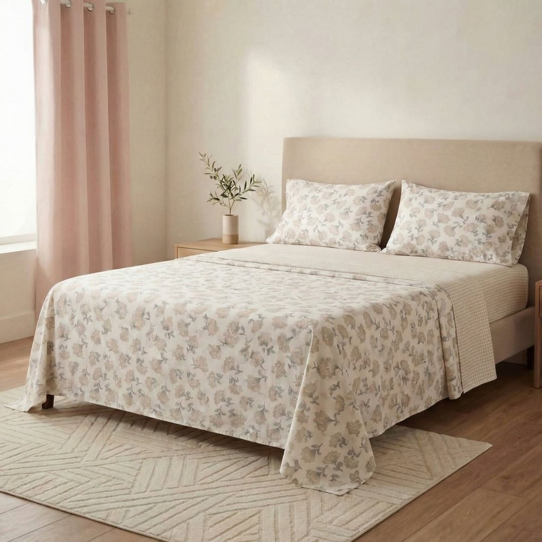 Jogo Cama Queen 4P Floral Bege - Oliveira Lopes