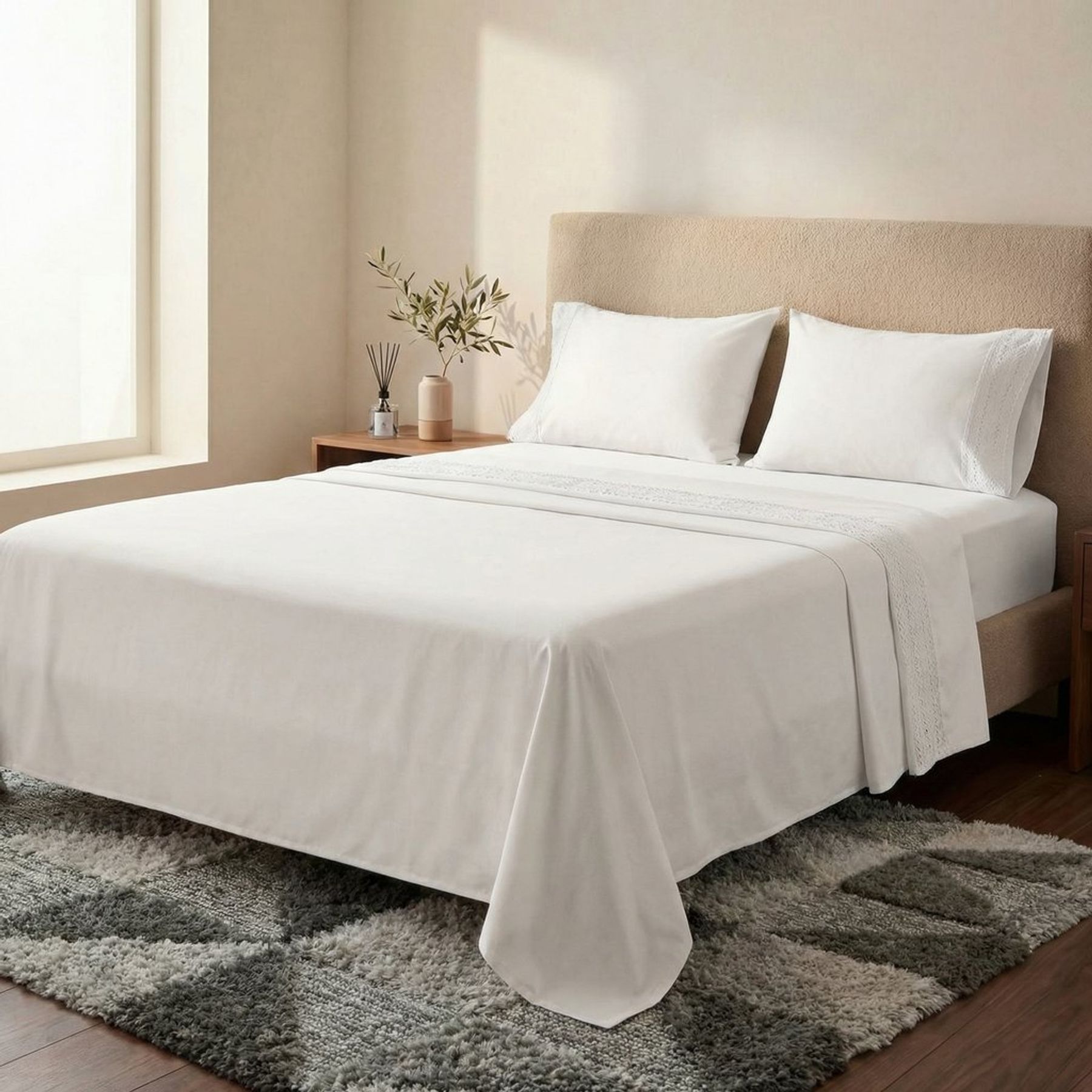 Economia de R$ 17,00O jogo de cama casal 4 peças Pernambucanas Casa é uma escolha versátil para compor o quarto com visual clean e elegante. Em branco, o tecido liso ganha destaque com faixas de bordado tom sobre tom, detalhes vazados e barra ondulada, criando um acabamento delicado.