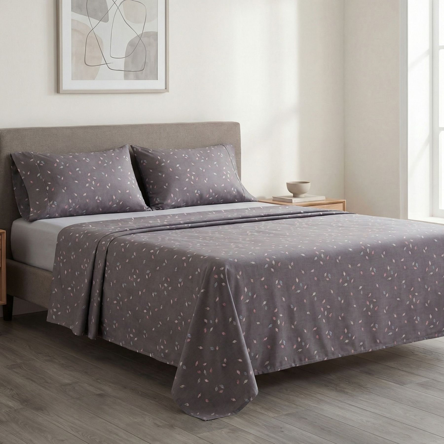 O visual combina lençol liso em cinza claro com peças em fundo cinza escuro e mini estampa floral, formando uma composição moderna e fácil de coordenar com outros itens do enxoval.