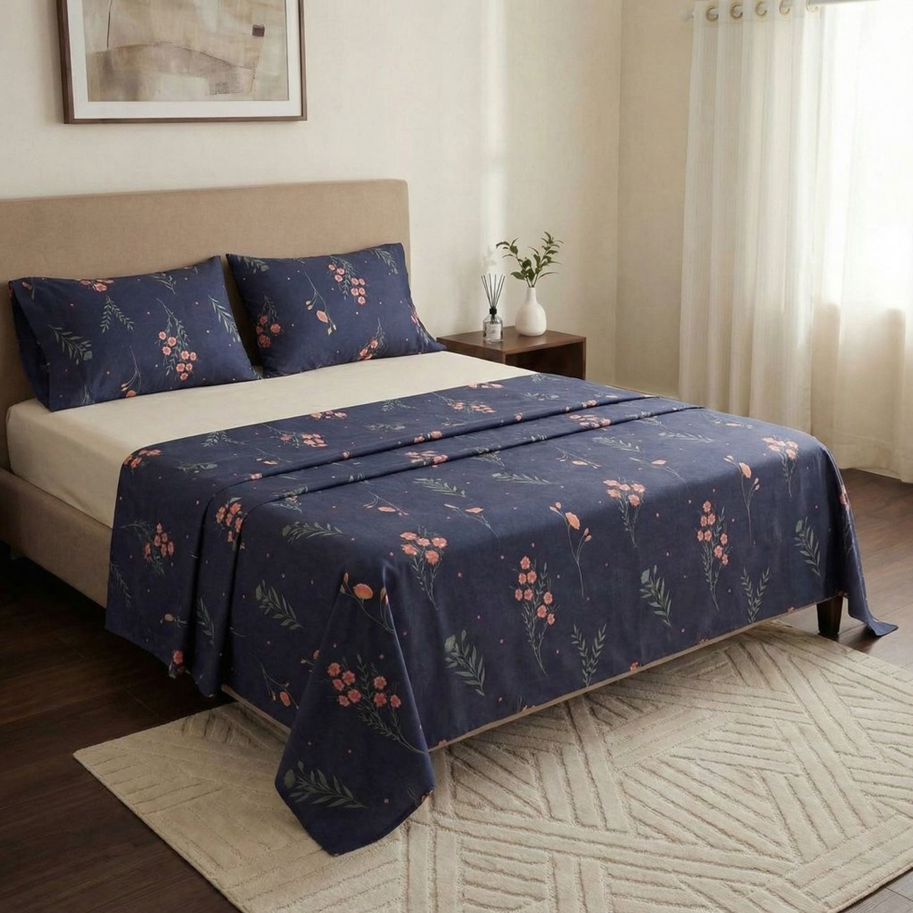 O conjunto combina estampa floral delicada em fundo azul-marinho com uma peça lisa em azul claro, criando um visual discreto e romântico que valoriza a decoração do quarto. Possui acabamento liso e é fácil de coordenar com outros itens de cama.