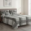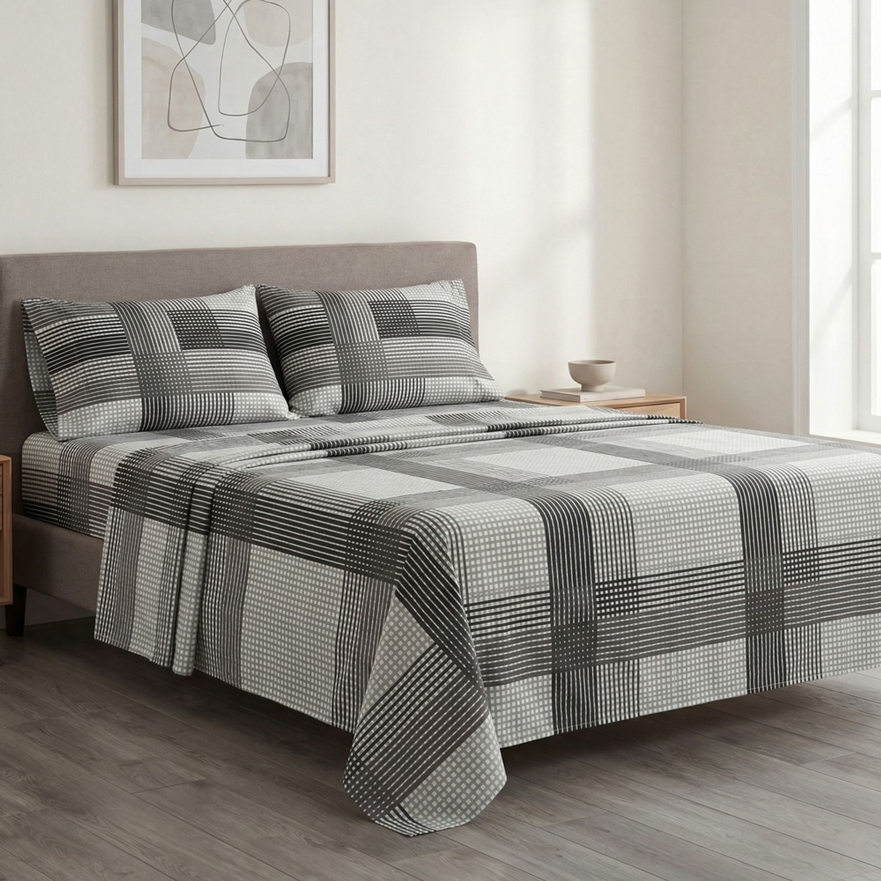 Economia de R$ 6,00O jogo de cama casal 4 peças é uma opção prática para atualizar o quarto com um visual moderno e neutro. A padronagem xadrez geométrica em blocos, com listras verticais e horizontais, combina facilmente com diferentes estilos de decoração.