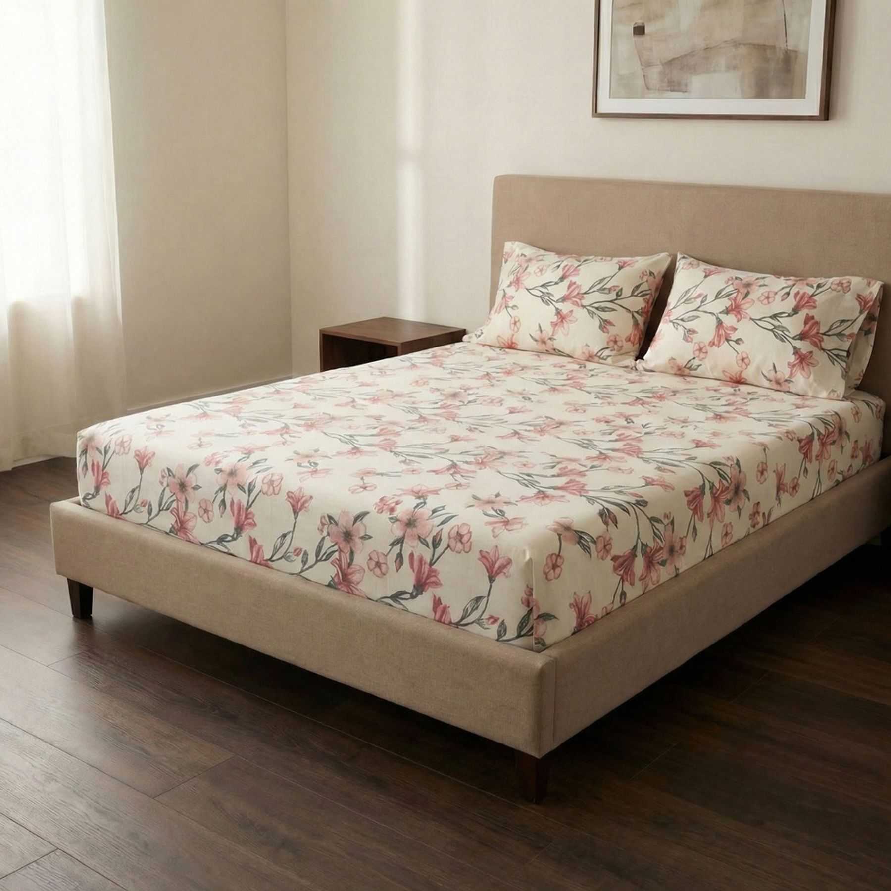 A estampa floral tem visual delicado e romântico, com flores grandes em tons de rosa e folhagens em verde escuro sobre fundo claro, deixando o ambiente mais acolhedor. O conjunto conta com estampa corrida e acabamento simples, facilitando o uso no dia a dia.