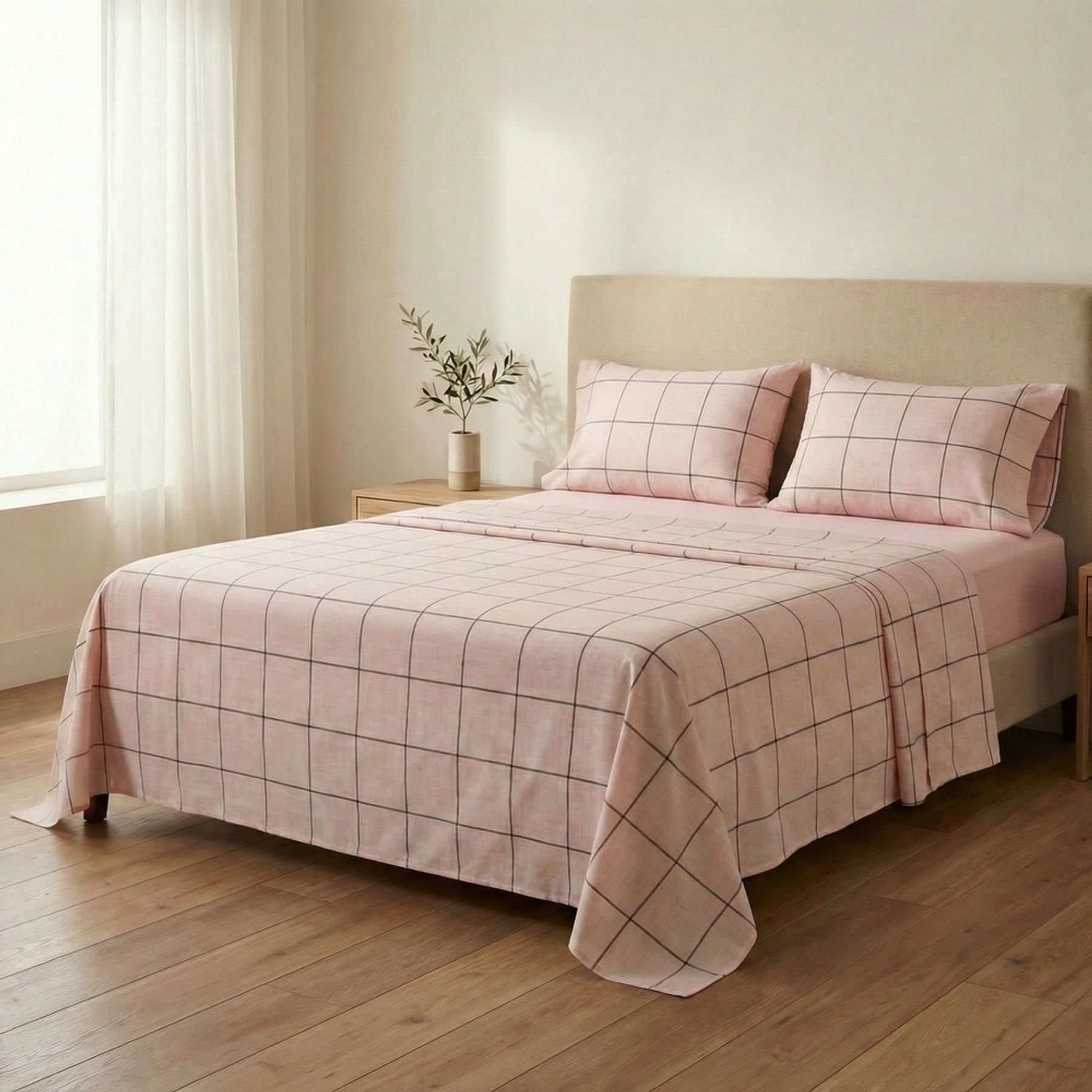 A estampa xadrez grid com linhas pretas sobre fundo rosa claro cria um contraste discreto e elegante, combinando bem com decoração neutra. O conjunto inclui 01 lençol, 01 sobrelençol e 02 fronhas, formando um kit completo para arrumar a cama com praticidade.