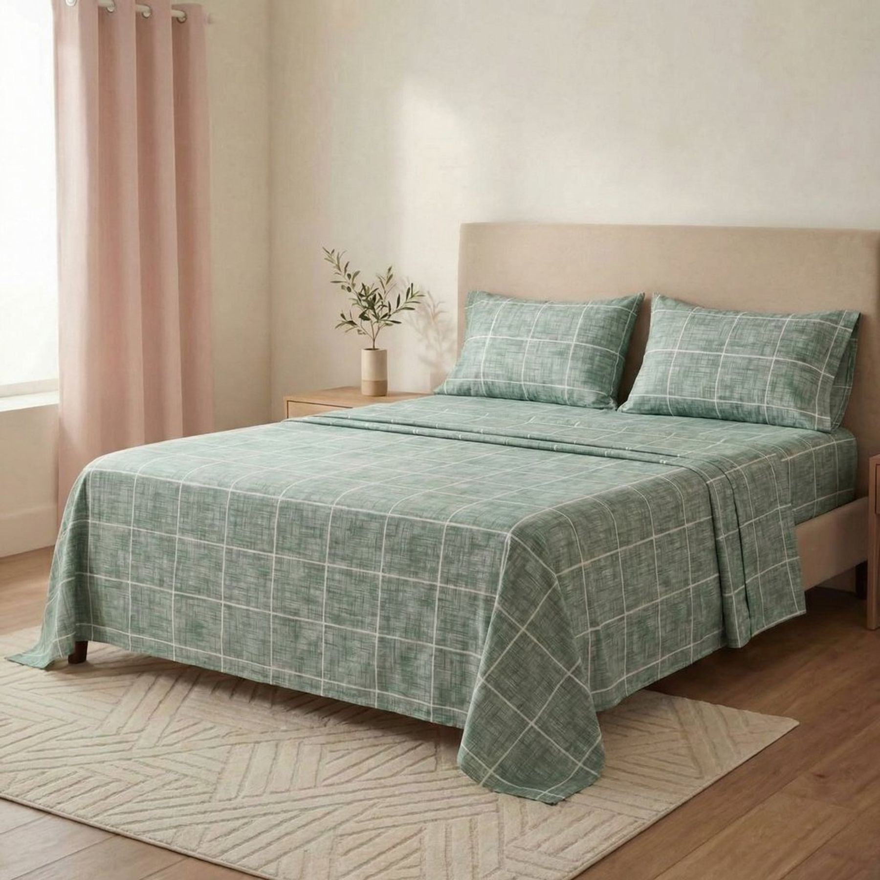 Economia de R$ 5,00O jogo de cama casal 4 peças Native Grid é uma opção prática para renovar o quarto com um visual moderno e fácil de combinar. A estampa em grade com linhas brancas sobre fundo verde acinzentado cria um efeito discreto e bem alinhado à decoração.