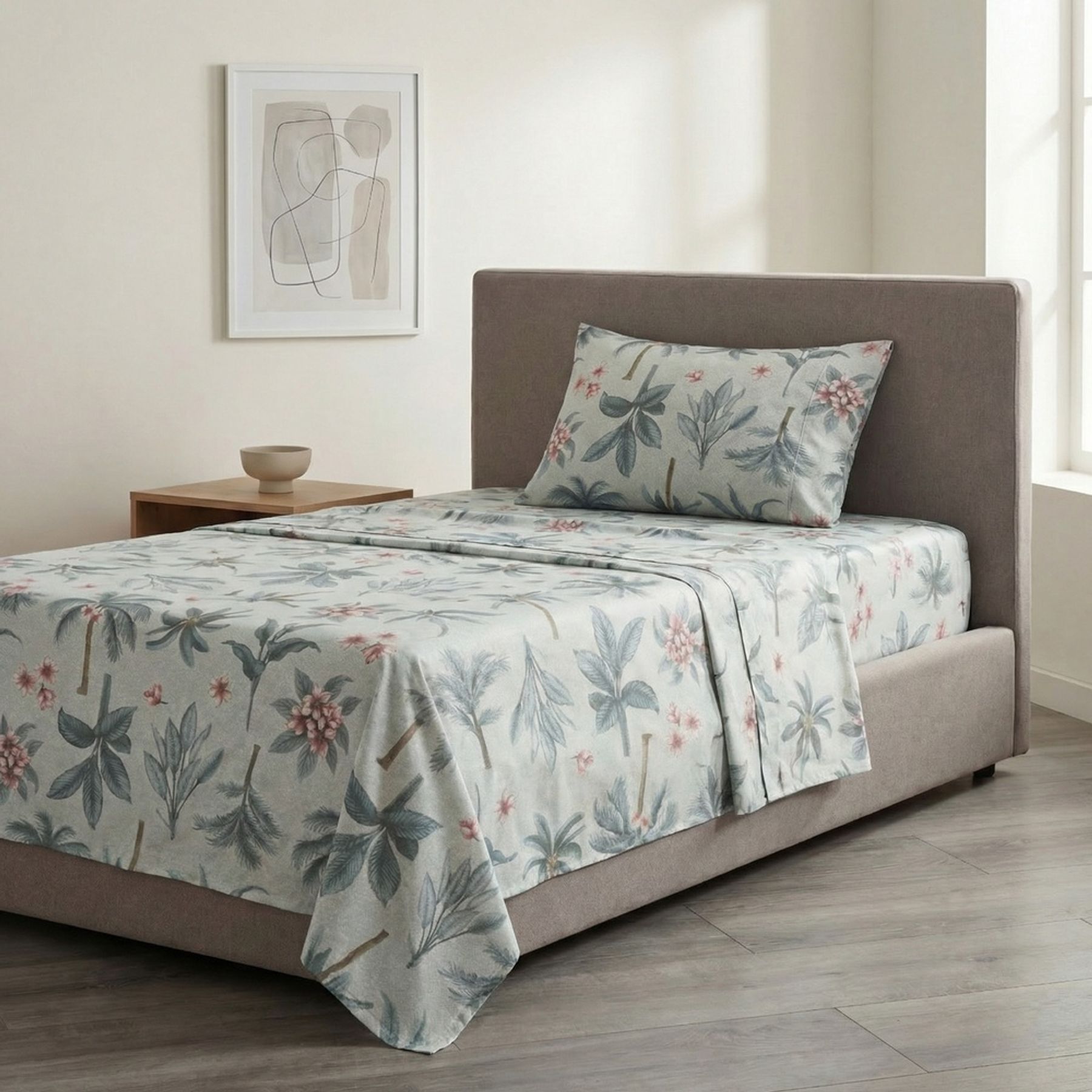 Economia de R$ 14,00O jogo de cama solteiro Tropicale traz um visual delicado para o quarto, com estampa floral em tons suaves sobre fundo claro, criando uma composição harmoniosa e acolhedora.