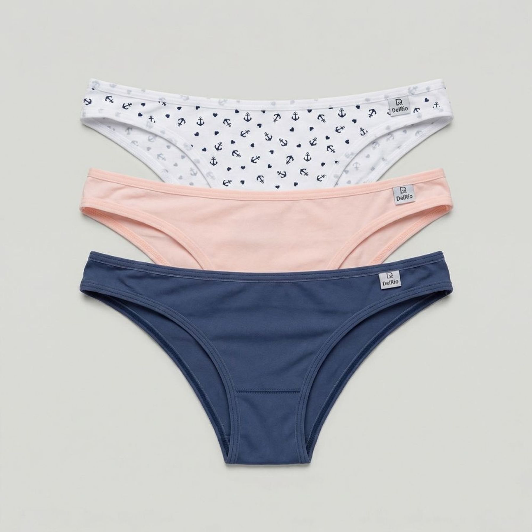 Economia de R$ 4,00Kit com 3 calcinhas tanga com estampa de âncora, toque leve e respirável.