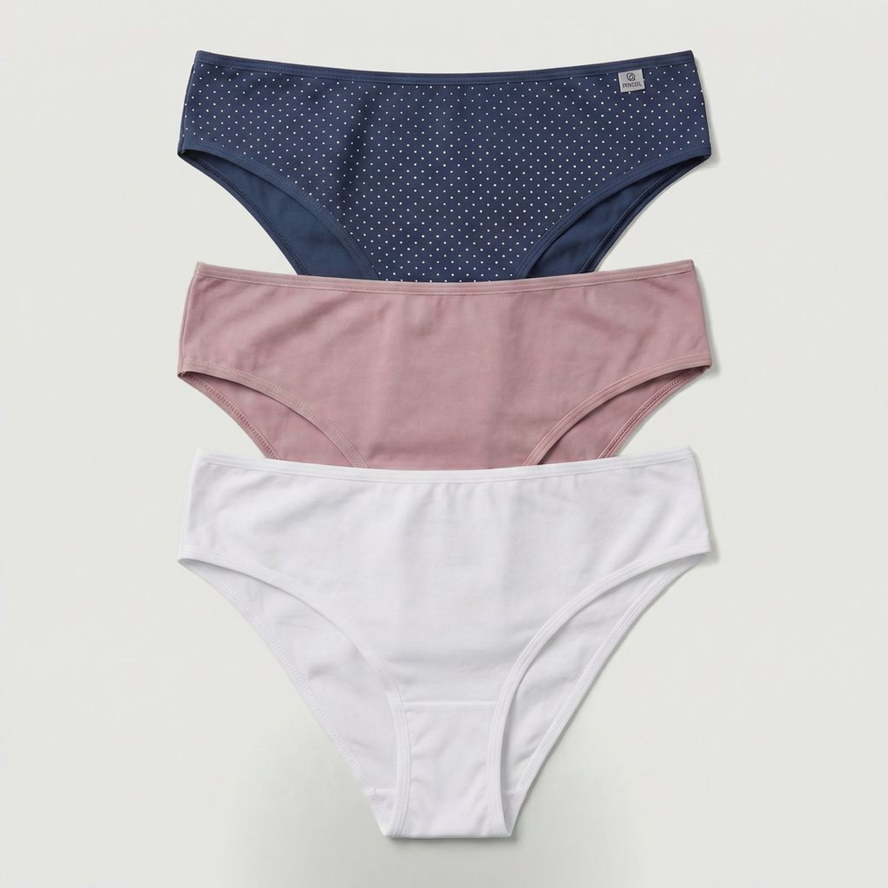 O conjunto reúne três peças em cores variadas, com cós liso e elástico embutido nas cavas para melhor encaixe e acabamento discreto. Uma das calcinhas traz estampa de poá pequeno, enquanto as outras duas são lisas.