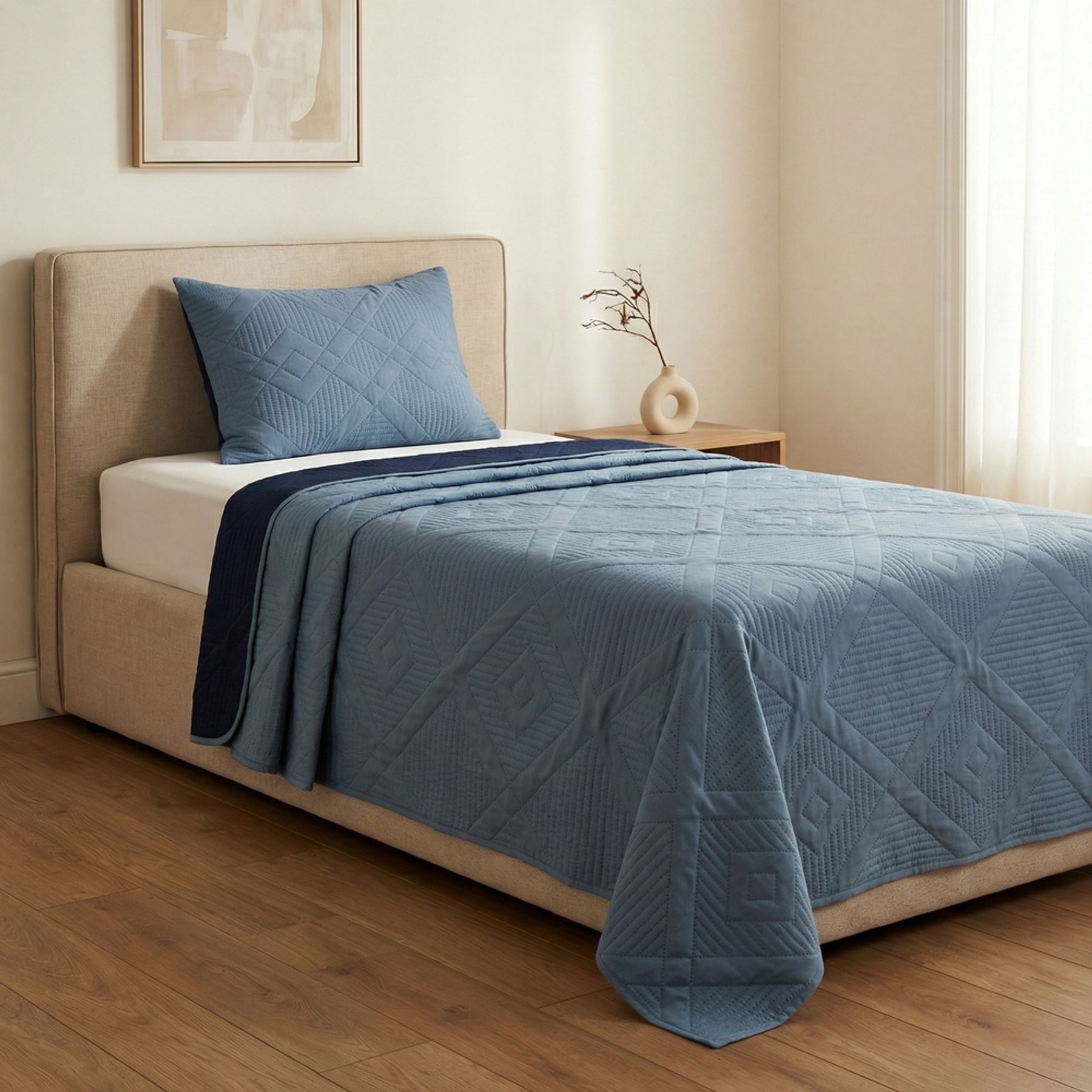 Economia de R$ 40,00O conjunto de colcha para cama de solteiro em microfibra lisa é uma opção prática para renovar a cama com um visual clean. Produzido em 100% poliéster, possui acabamento matelassado com relevo geométrico discreto tom sobre tom, que adiciona textura com suavidade. A cor azul monocromática facilita combinações na decoração, e os cantos arredondados da colcha contribuem para um caimento mais harmonioso. Itens inclusos: 01 colcha e 02 fronhas.