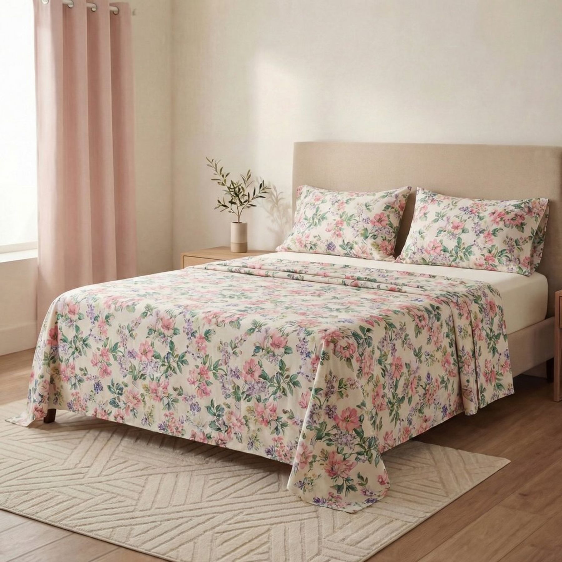 Economia de R$ 14,00O Enxoval 4 Peças Casal Sarah Flowers leva um toque romântico ao quarto com estampa floral delicada em fundo claro e composição coordenada. A peça principal é matelassada/acolchoada e acompanha lençol liso em tom suave, criando uma cama harmoniosa.