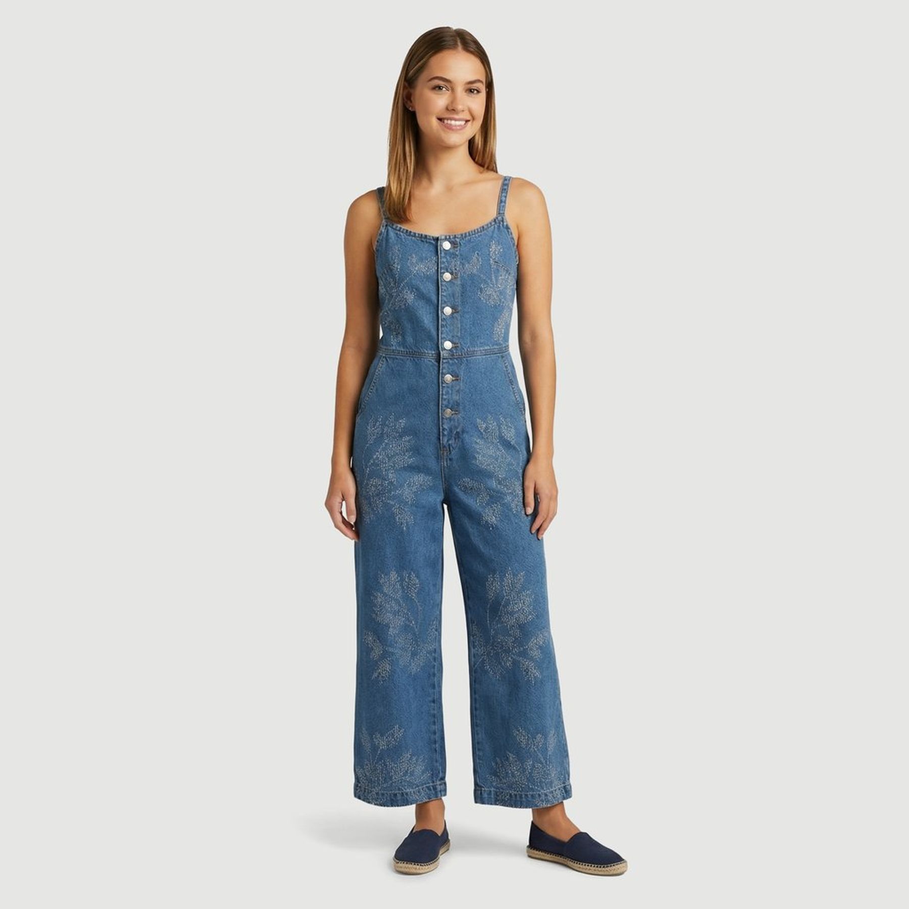 O destaque fica por conta da estampa floral discreta em tom sobre tom, que adiciona charme ao look. O modelo sem manga conta com alças finas reguláveis e fechamento frontal por botões, além de bolsos frontais e costuras aparentes que valorizam o acabamento.