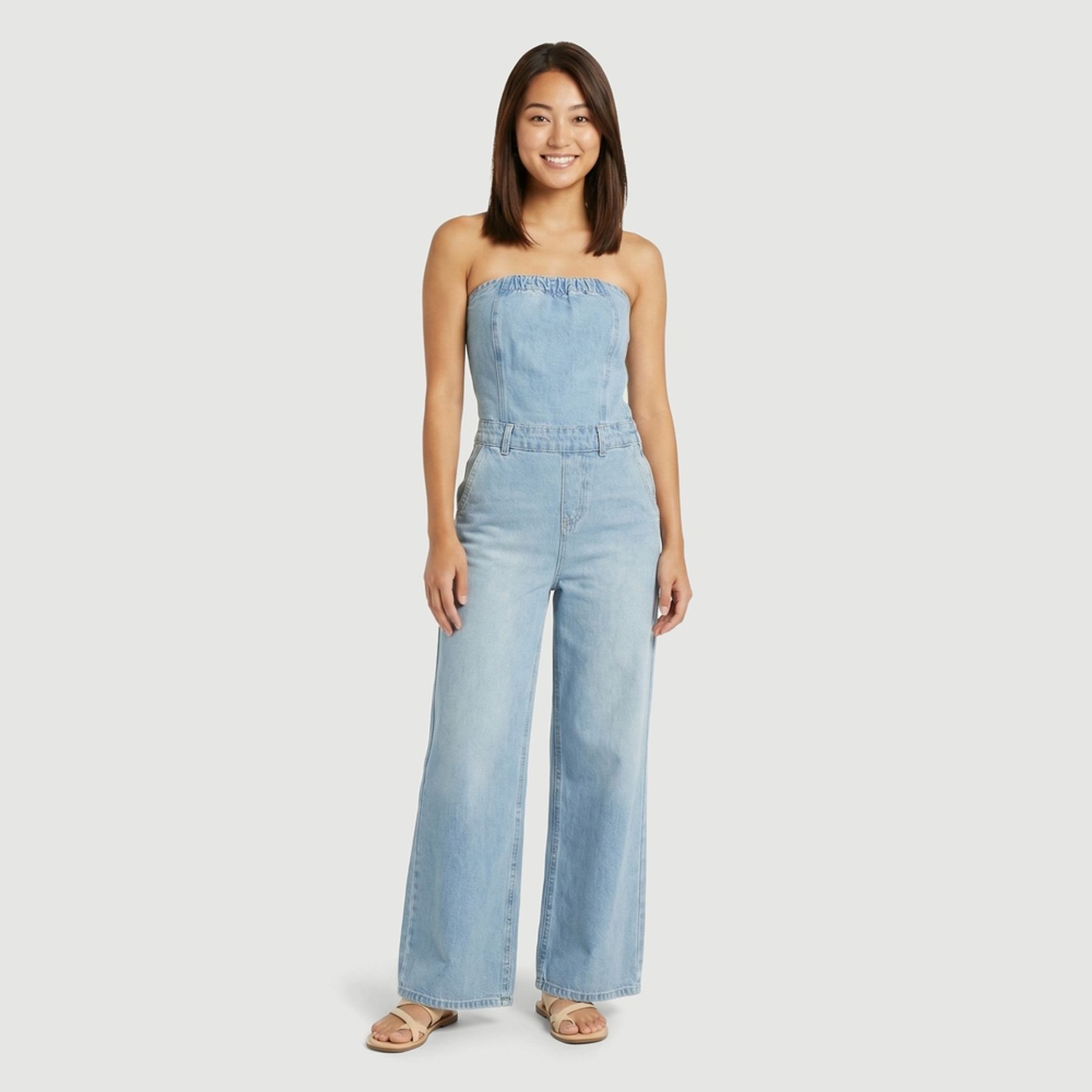 Economia de R$ 25,00Macacão jeans feminino Sawary confeccionado em 100% algodão, com visual minimalista em azul claro e efeito lavado suave. O modelo tomara-que-caia (sem alças) destaca a parte superior, enquanto a modelagem wide leg com perna reta ampla garante um caimento moderno.
