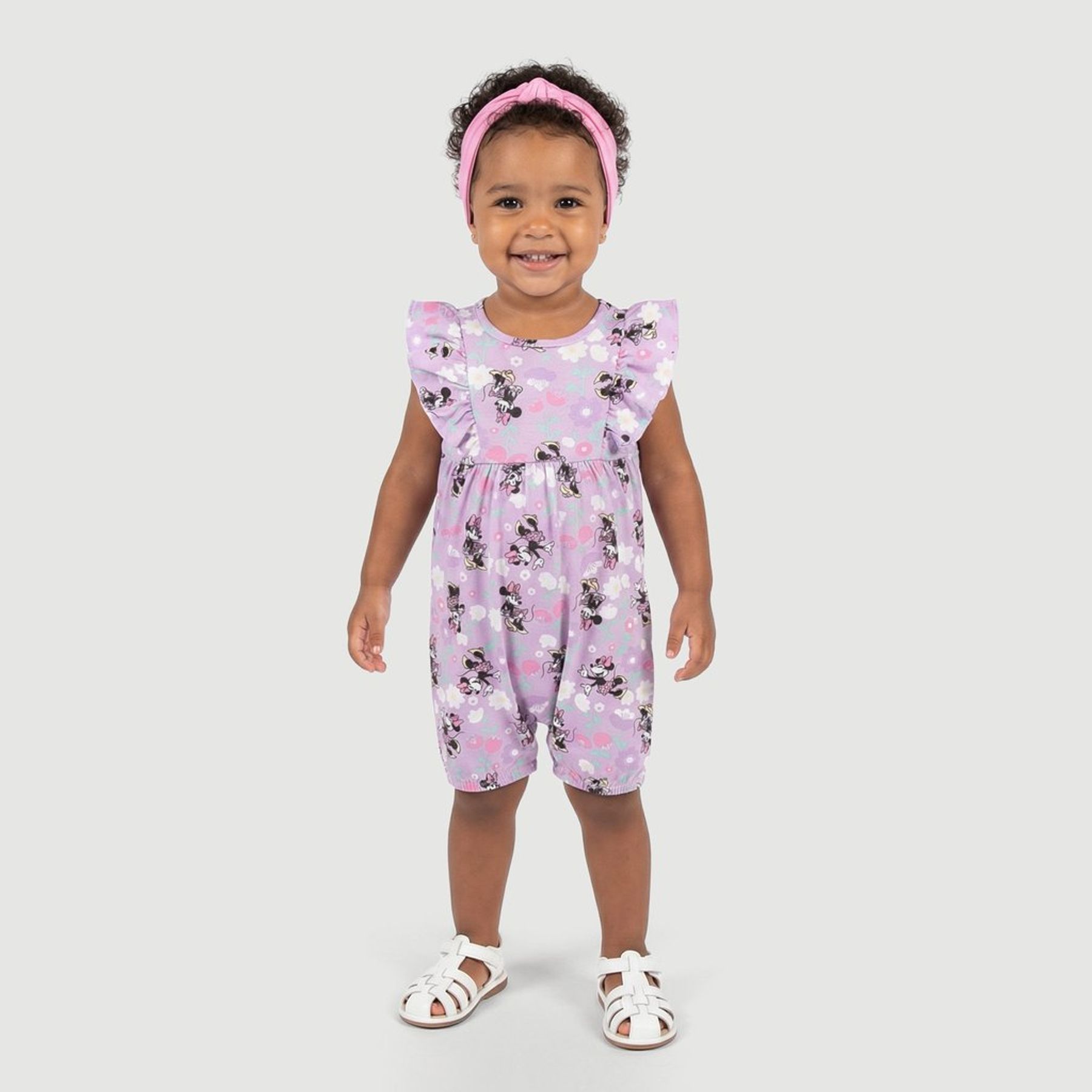 Economia de R$ 6,00Macacão bebê Disney em malha com predominância de algodão e estampa full print da Minnie Mouse sobre fundo lilás. O modelo tem manga curta, gola redonda, babados nos ombros e recorte na cintura com franzido, além de barra com elástico nas pernas para melhor ajuste. Acompanha faixa de cabelo lisa combinando para completar o look.