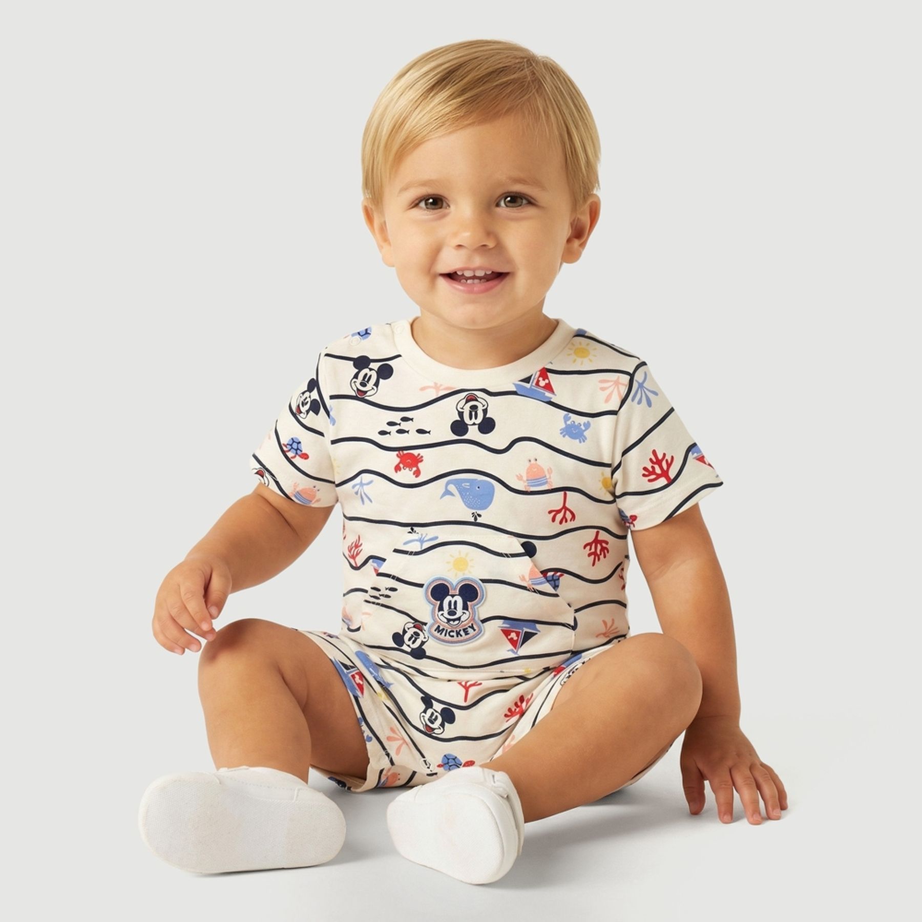 A estampa corrida do Mickey Mouse em tema náutico aparece em tons de creme e azul, com listras/ondas e elementos do mar. Possui manga curta, gola redonda e botões de pressão no ombro para facilitar na hora de vestir, além de bolso canguru frontal com destaque do personagem. Item incluso: 01 macacão.