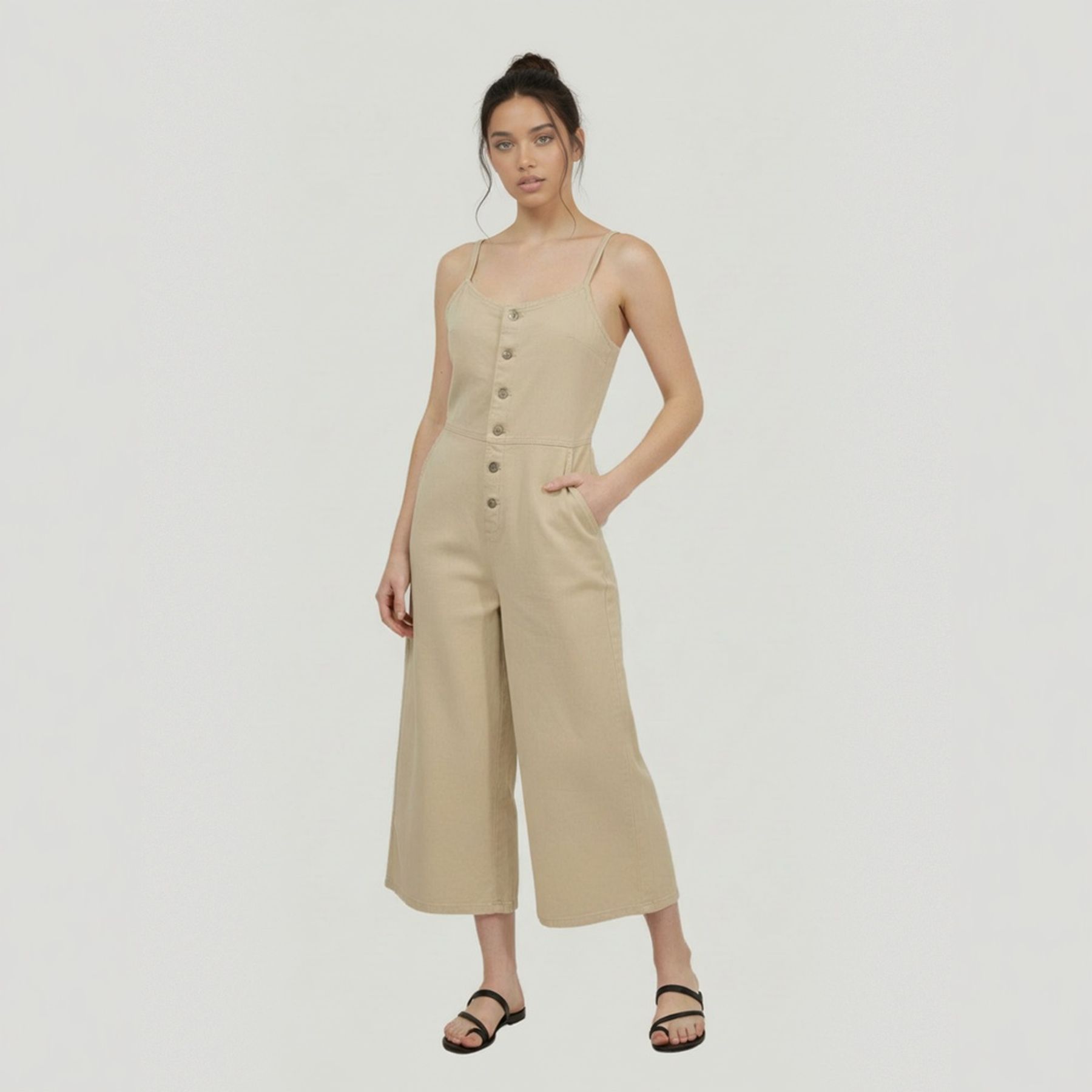 Economia de R$ 81,00Macacão feminino pantacourt confeccionado em sarja de algodão, com alças finas e fechamento frontal por botões. O modelo possui bolsos frontais funcionais e apresenta visual versátil, ideal para montar produções descomplicadas. A cor areia neutra proporciona fácil combinação com diversos acessórios e sapatos em diferentes ocasiões.