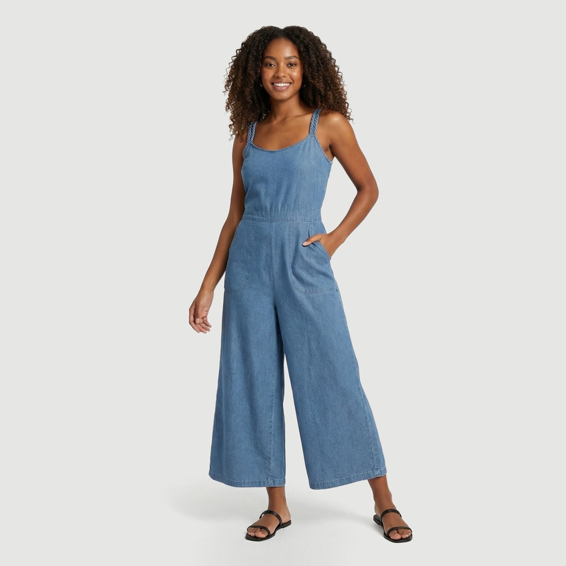 Macacão Feminino Jeans Pantalona com Alças Trançadas Azul Liso - Ink