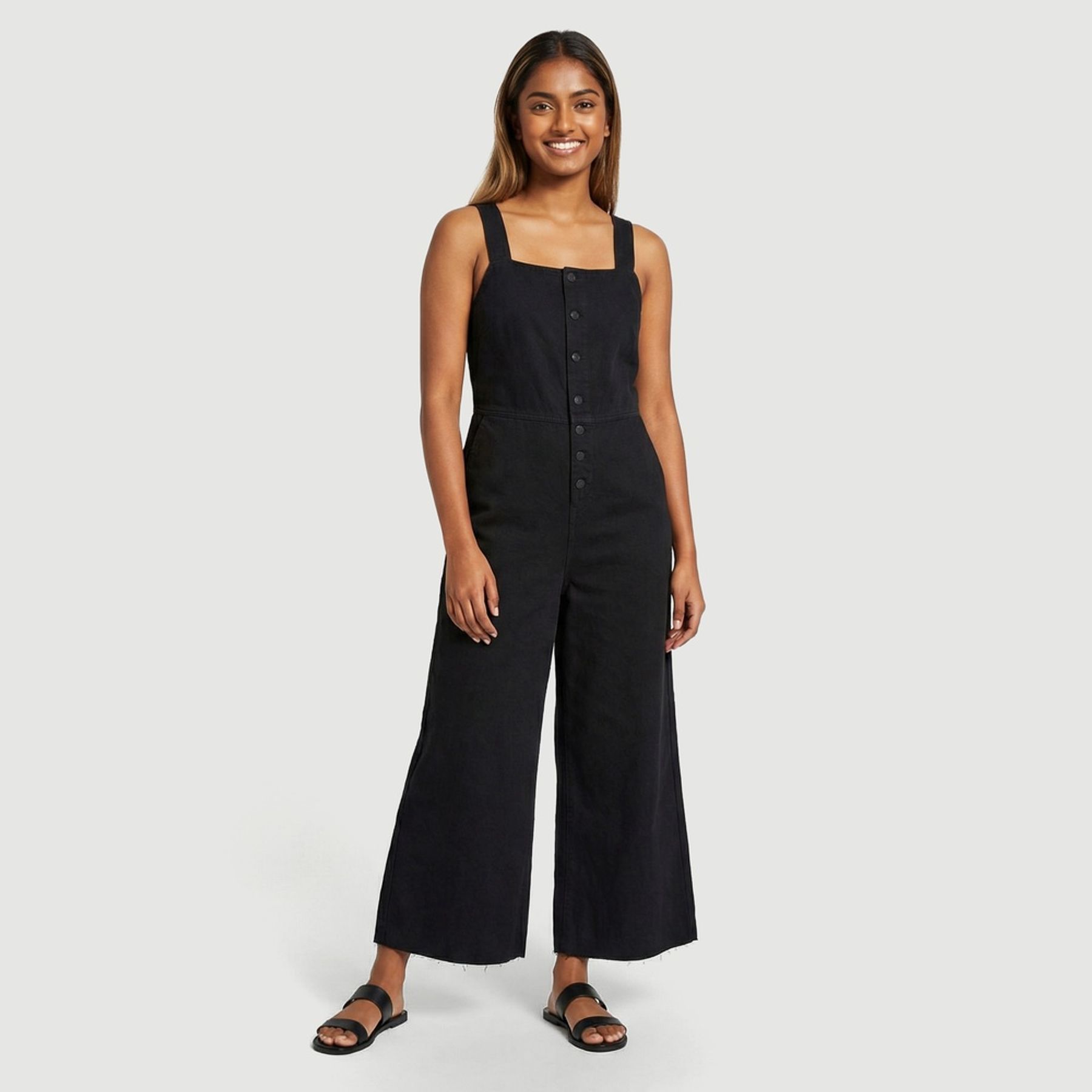 Macacão Feminino Jeans Cropped com Botões Preto Liso - Ink