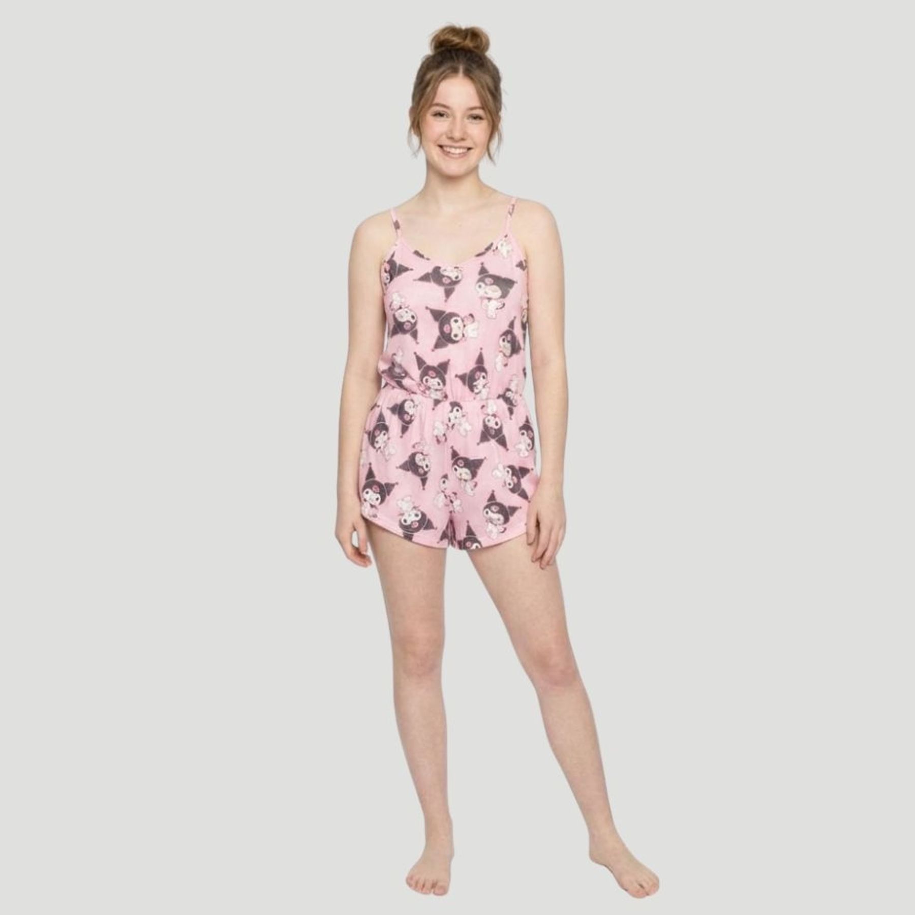 Economia de R$ 8,00Macaquinho feminino com estampa licenciada da Kuromi, ideal para compor produções práticas e cheias de personalidade. Confeccionado em tecido misto com predominância de poliéster, traz alças finas com regulador, decote reto e cintura com elástico, oferecendo bom ajuste ao corpo. A modelagem tipo romper completa o visual com um toque jovem.
