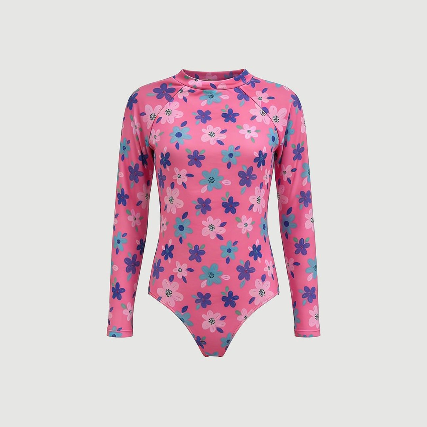 Maiô Feminino Manga Longa Zíper Floral Rosa - Yeapp