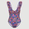 Economia de R$ 16,00Maiô infantil Toys & Kids inteiro, ideal para praia e piscina, com decote arredondado e babado na gola/decote. As alças largas e a cava alta ajudam no ajuste, enquanto o viés contrastante em roxo destaca o acabamento.