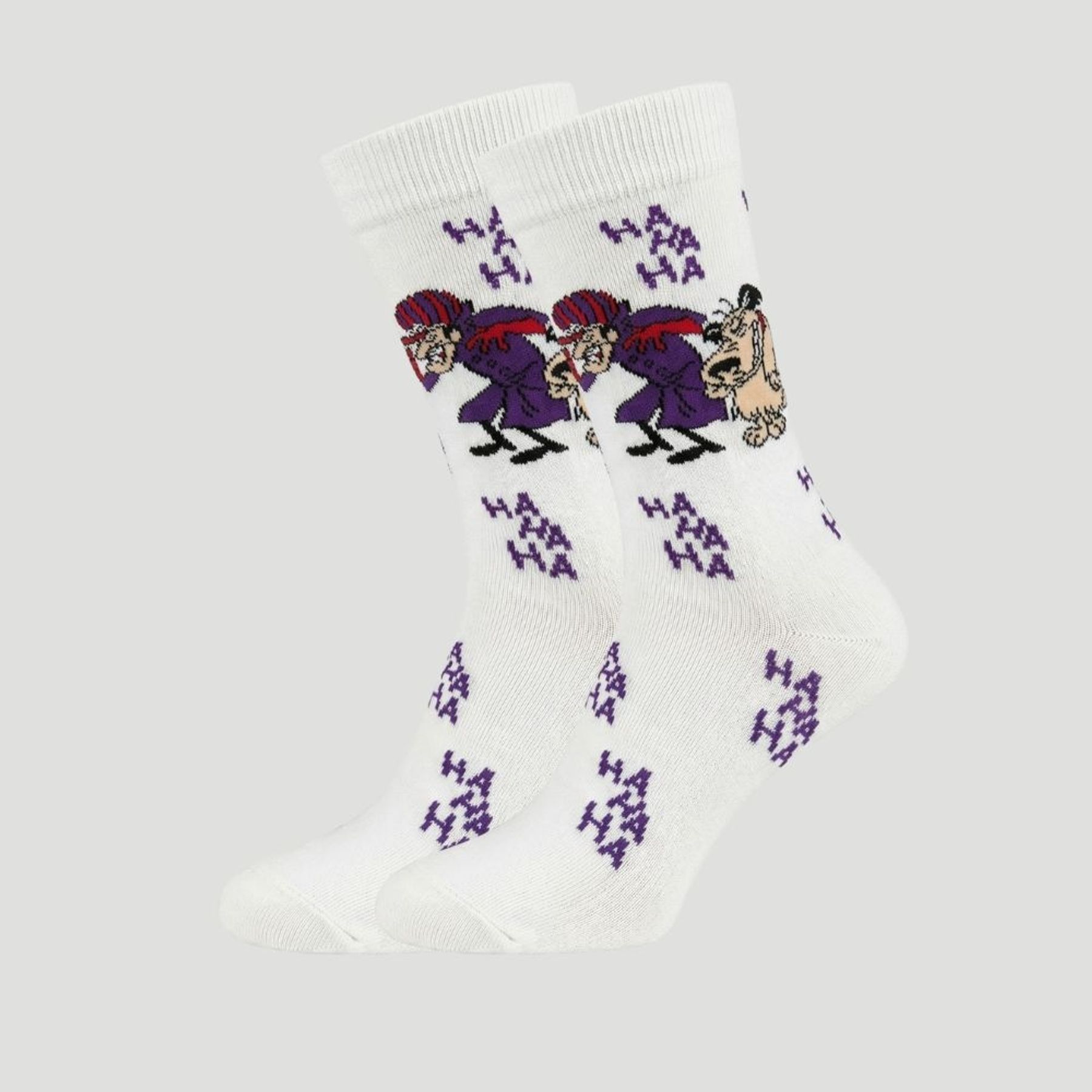 Economia de R$ 2,00A meia cano longo Corrida Maluca traz a dupla Dick Vigarista e Muttley em uma estampa divertida, com escrita "HA HA HA" em roxo. Feita em 100% algodão, oferece toque macio e boa respirabilidade para o uso diário. O punho canelado ajuda a manter a peça firme no pé, enquanto a base clara facilita combinar com diferentes looks.