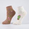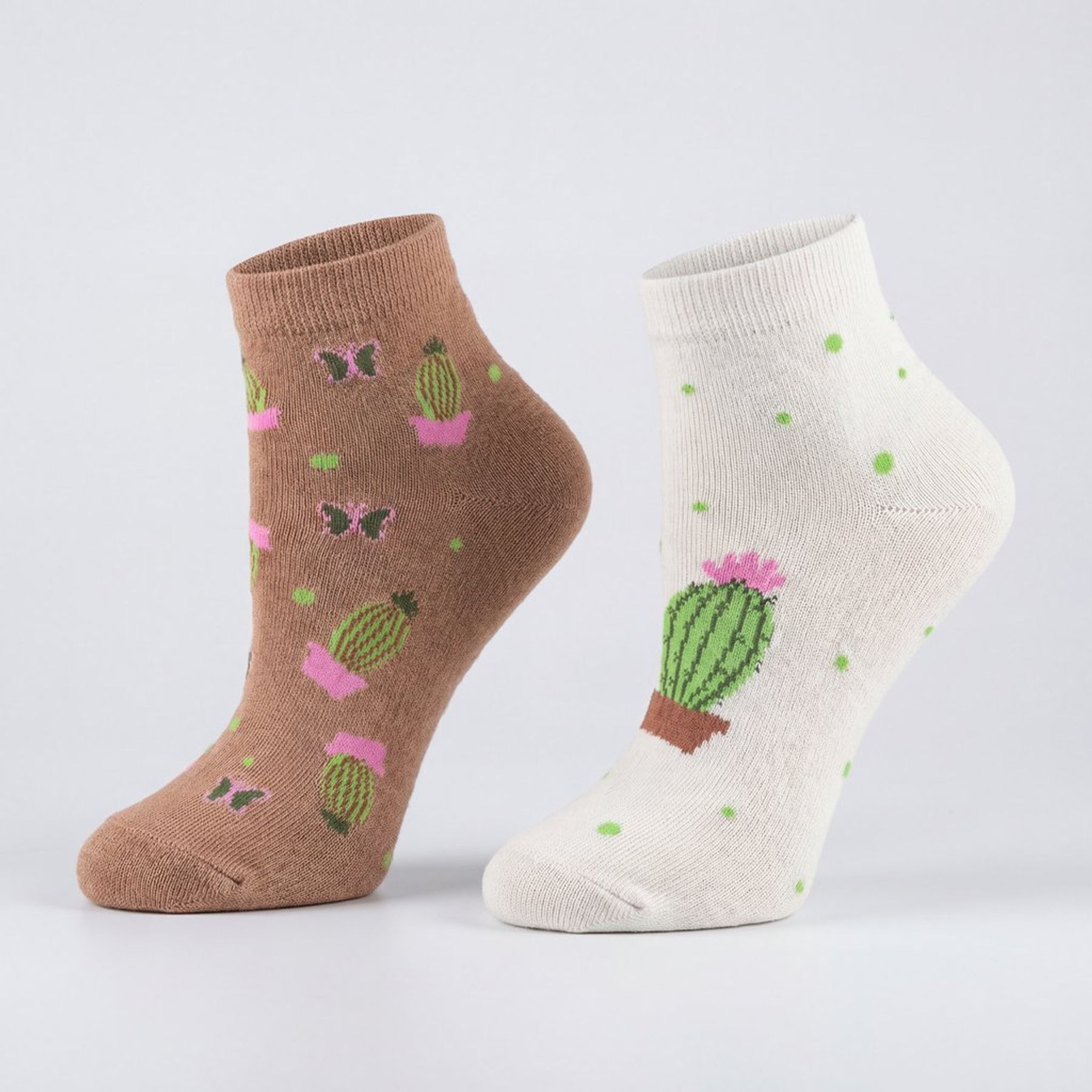 O destaque fica por conta das estampas com tema cactos e poá: uma meia em tom creme com cacto central e poás verdes, e outra em marrom com mini cactos em vasos, borboletas e poás, criando um visual delicado e divertido.