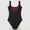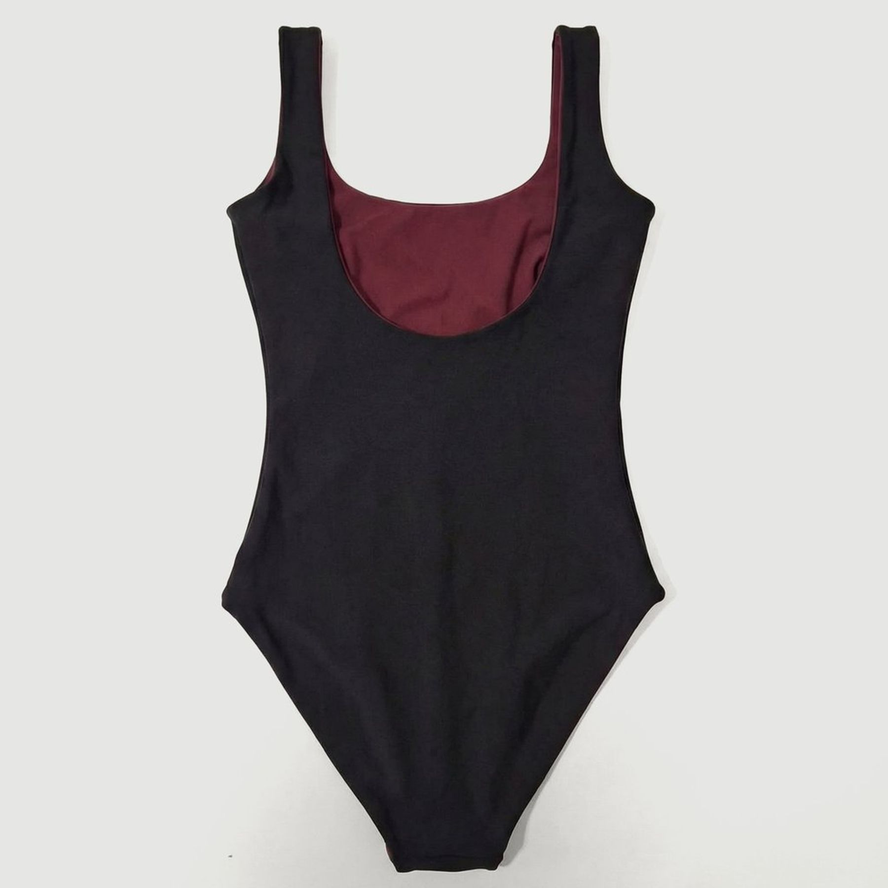 O design liso bicolor traz base preta com recortes laterais em vinho, criando contraste que valoriza o contorno. Possui decote quadrado/retangular, alças largas e cava alta, com acabamento liso sem aviamentos aparentes, combinando bem com propostas de praia e esportivas.